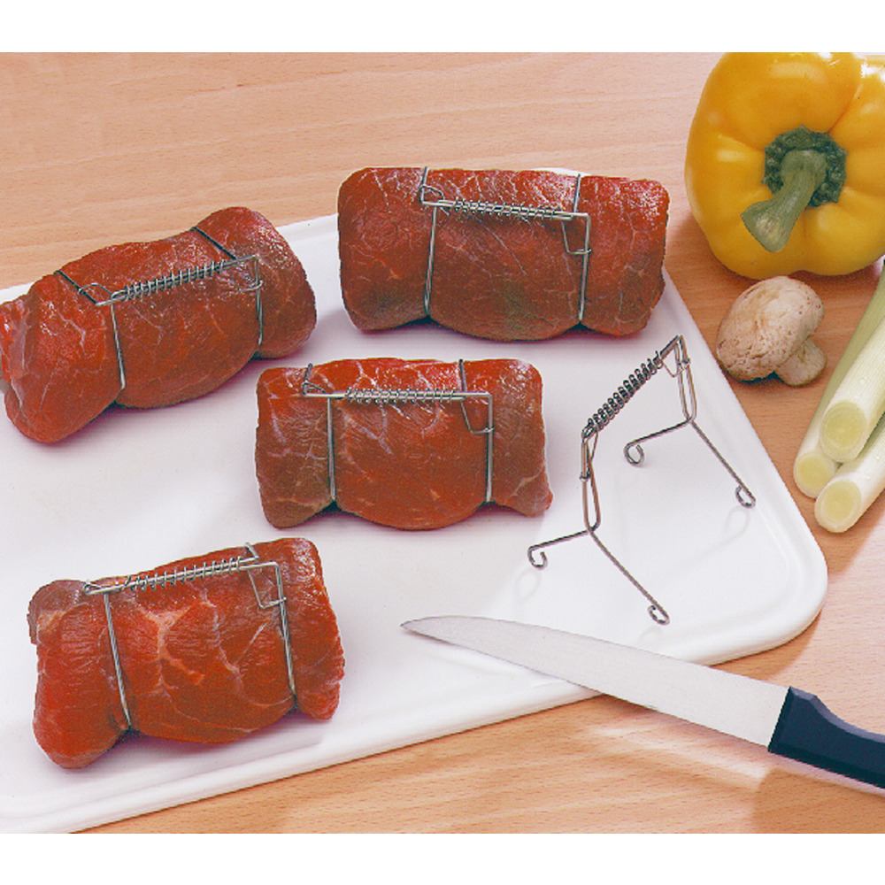 Klammern einfach um die Rouladen klemmen- fertig! Wiederverwendbar, rostfrei,Maße 6,5 x 7,5 x 6,0 cm.