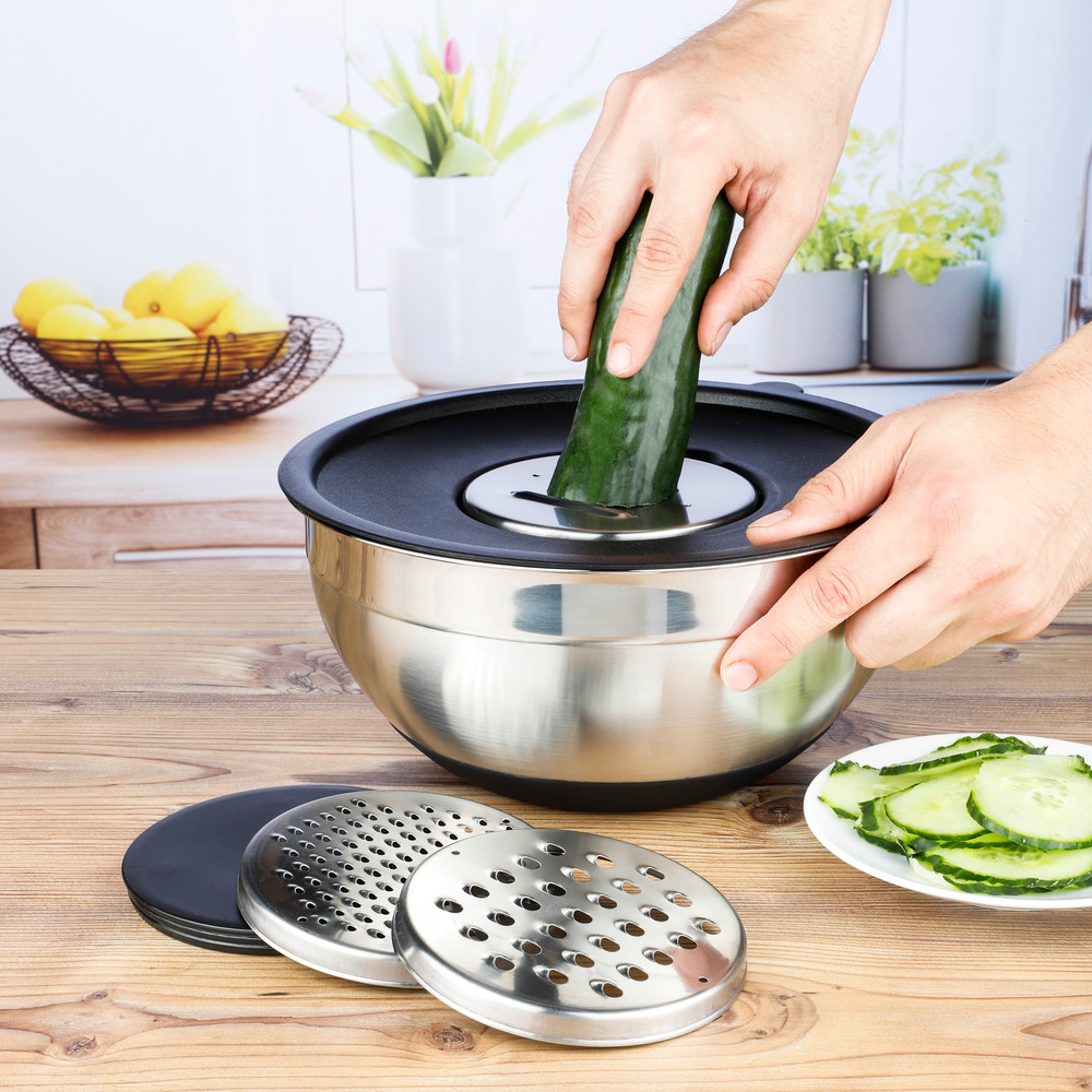 Die Rührschüssel besteht aus rostfreiem Edelstahl, der langlebig und leicht zu reinigen ist. Die silikonbeschichtete Unterseite sorgt für einen stabilen Halt während des Rührens oder Reibens. Ca. 24cmDrei verschiedene Reiben-Einsätze: