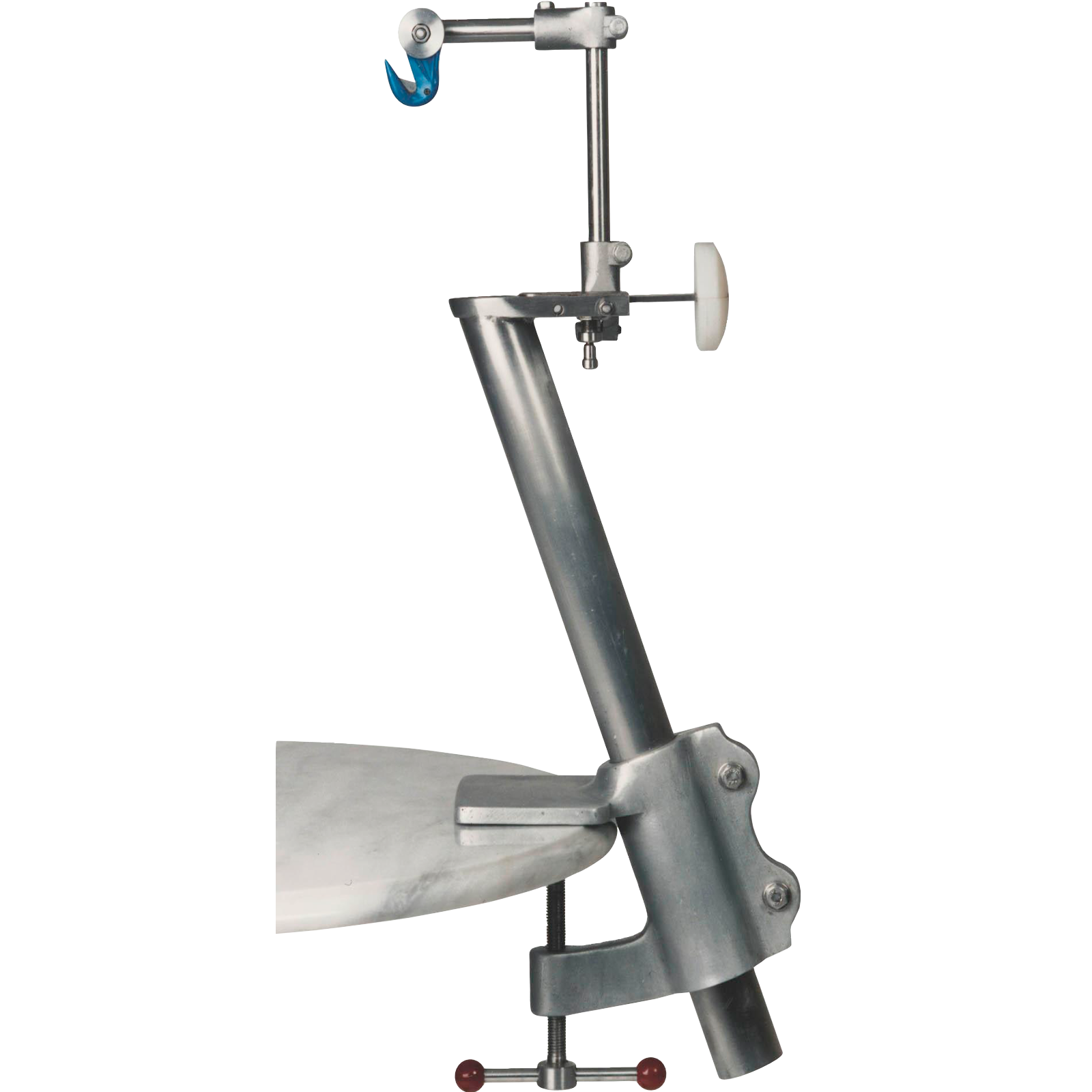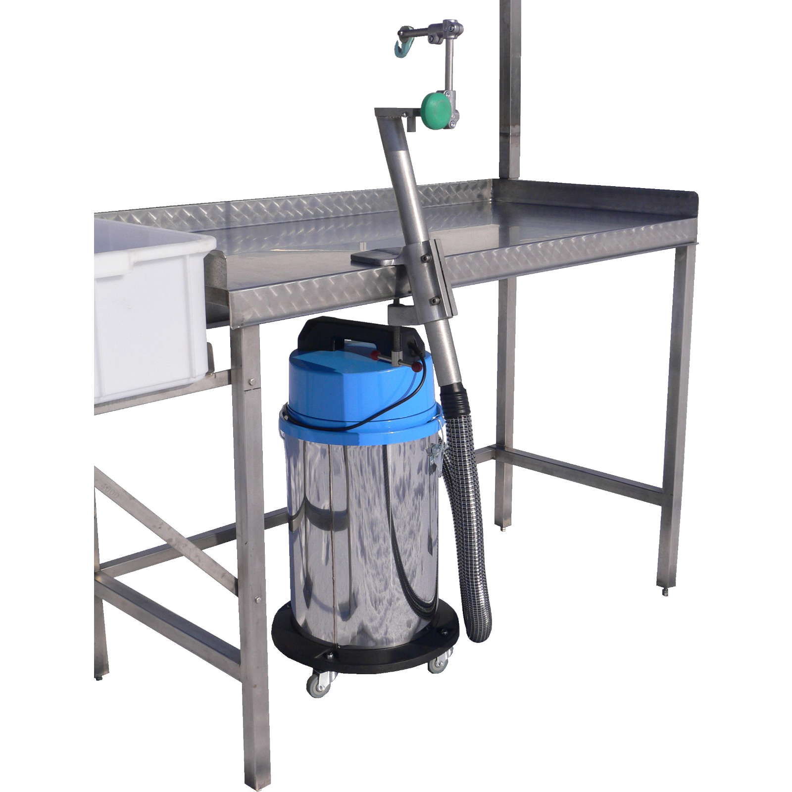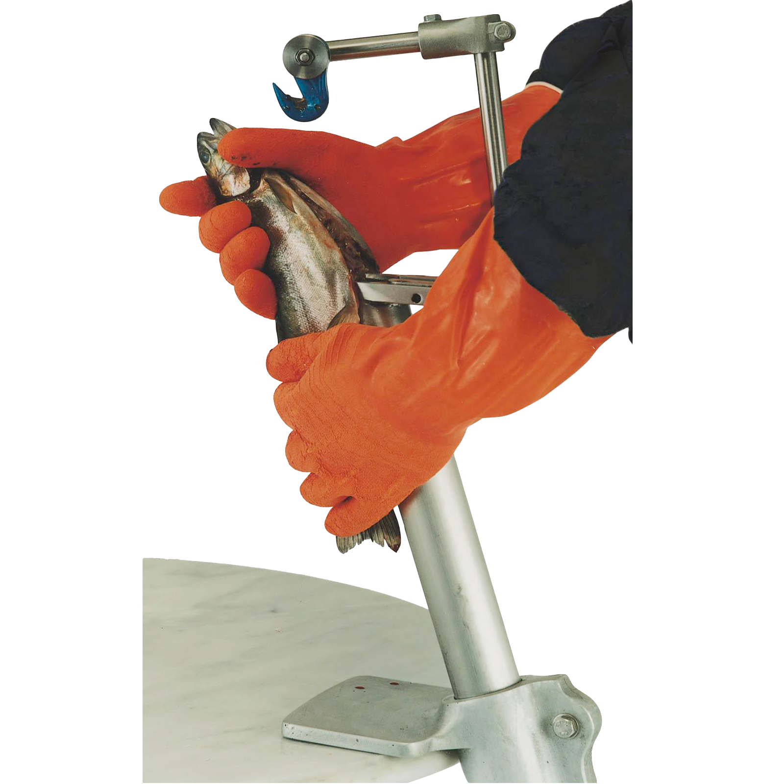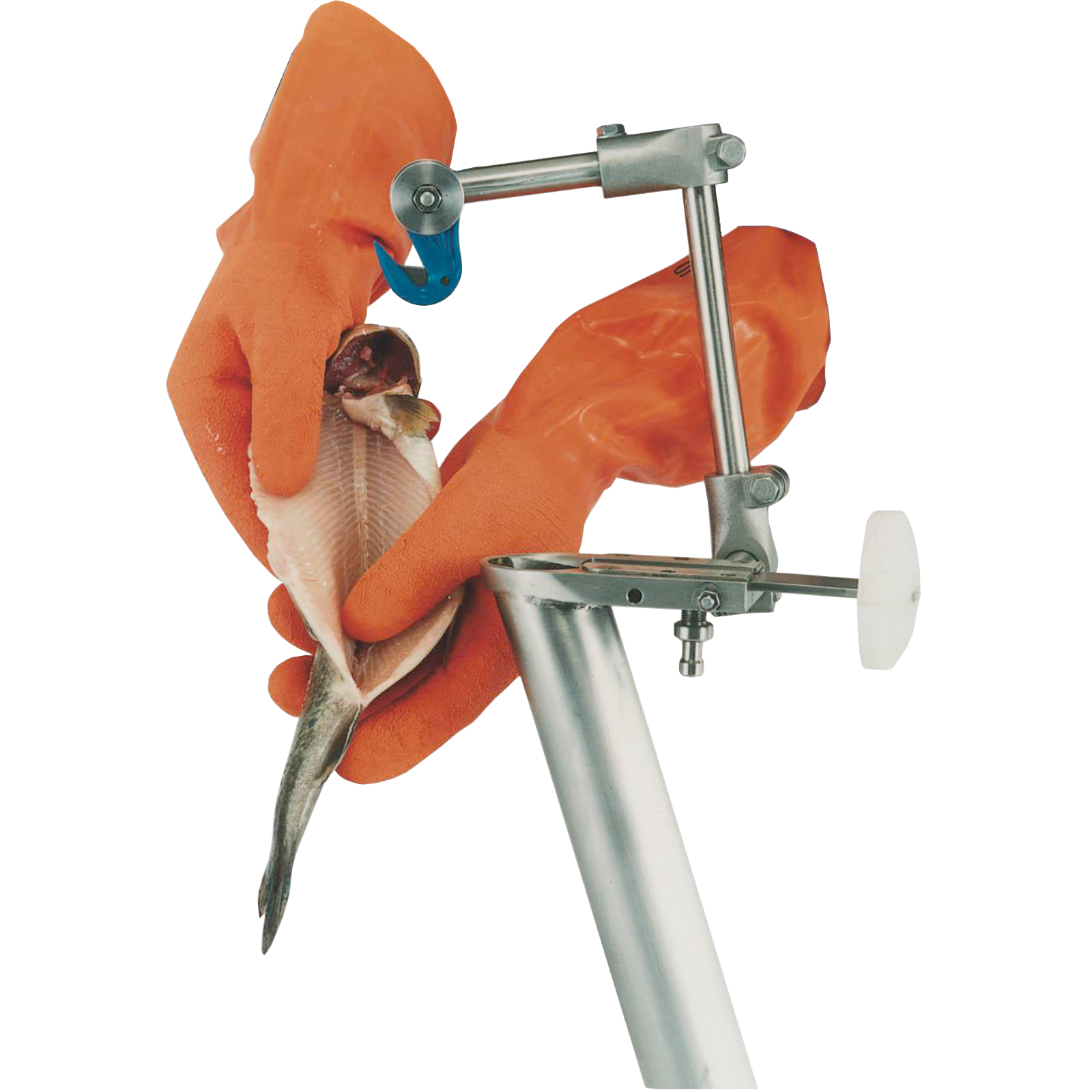 Schlachthilfe – KompaktDie praktische Alternative zum bewährten Schlachthilfesystem: Diese kompakte Version funktioniert ganz ohne Strom oder Druckluft.Auch ein Vakuumsauger ist nicht zwingend nötig – kann aber bei Bedarf zur Steigerung der Leistung zusätzlich angeschlossen werden.Die Montage ist einfach und an jedem Arbeitstisch möglich, ideal auch für unterwegs, z.B. auf Fischmärkten.Der Fisch wird mithilfe eines Hakenmessers vom After her zum Kopf aufgeschnitten.Anschließend wird der Fisch gegen das Gerät gedrückt (siehe Bild 2), wobei die Innereien entweder direkt in die vorgesehene Öffnung geschoben oder – bei Verwendung eines Vakuumsaugers – automatisch abgesaugt werden.Ohne Sauger fallen die Eingeweide in einen darunter stehenden Auffangbehälter.Durch Betätigen des Druckknopfs (siehe Bild 3) werden Eingeweide samt Schlund fixiert und durch ein einfaches Herunterziehen des Fisches sauber entfernt.Danach muss der Fisch nur noch abgespült werden – und ist sofort küchenfertig.