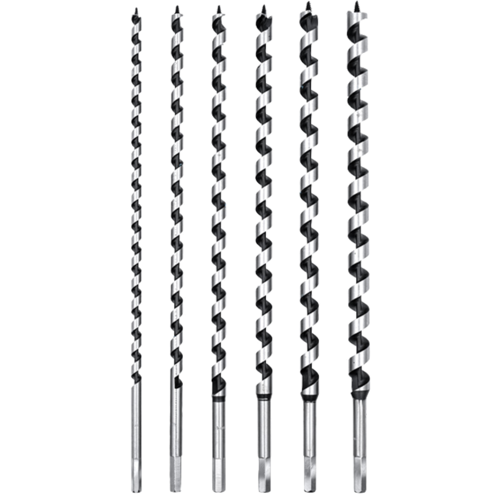 Schlangenbohrersatz 6-tlg., in den Durchmessern 10, 12, 14, 16, 18, 20 mm,Bohrkopf mit selbstanziehender Gewindespitze ermöglicht schnelle Bohrungen mit geringem Kraftaufwand,für präzise Bohrungen in Holzbalken und bei Dachstuhlarbeiten, im Blow-Mold-Koffer.