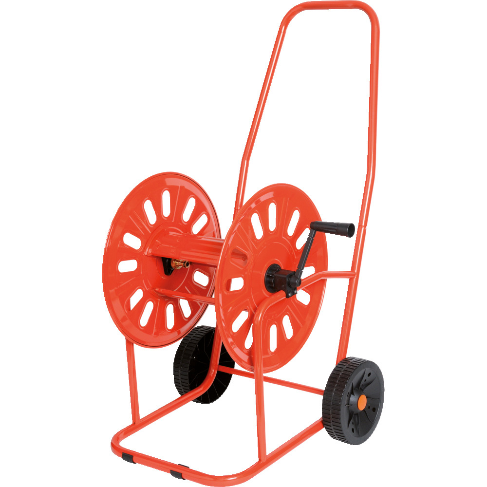 Robuster Schlauchwagen aus pulverbeschichtetem Metall. Hochwertige Messinganschlüsse, geeignet für 80 m ½“ oder 50 m ¾“ Schlauch.