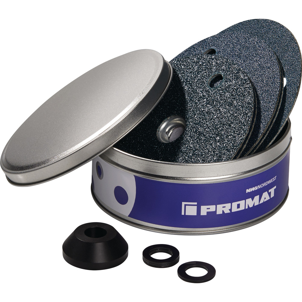 Für beidseitiges Schleifen und sicheren Einsatz in schmalen Nuten dank einer extrem widerstandsfähigen Scheibenkonstruktion. Drei Sicht- und Kühllöcher ermöglichen freie Sicht auf das Werkstück. Es besteht keine Hitzeverfärbung am Werkstück und ermöglicht ein kontrolliertes Anbringen von Fasen. Unkompliziertes System zur Scheibenaufnahme in Form eines Adapters (kein Stützteller notwendig). Eignet sich auch für den Einsatz auf Holz. Komplett-Set mit folgendem Inhalt: Schleifscheibe 1 x K40 / 2 x K60 / 2 x K80, Kunststoffadapter für M14 Gewinde, 2 Stück Distanzringe - in Metalldose verpackt.