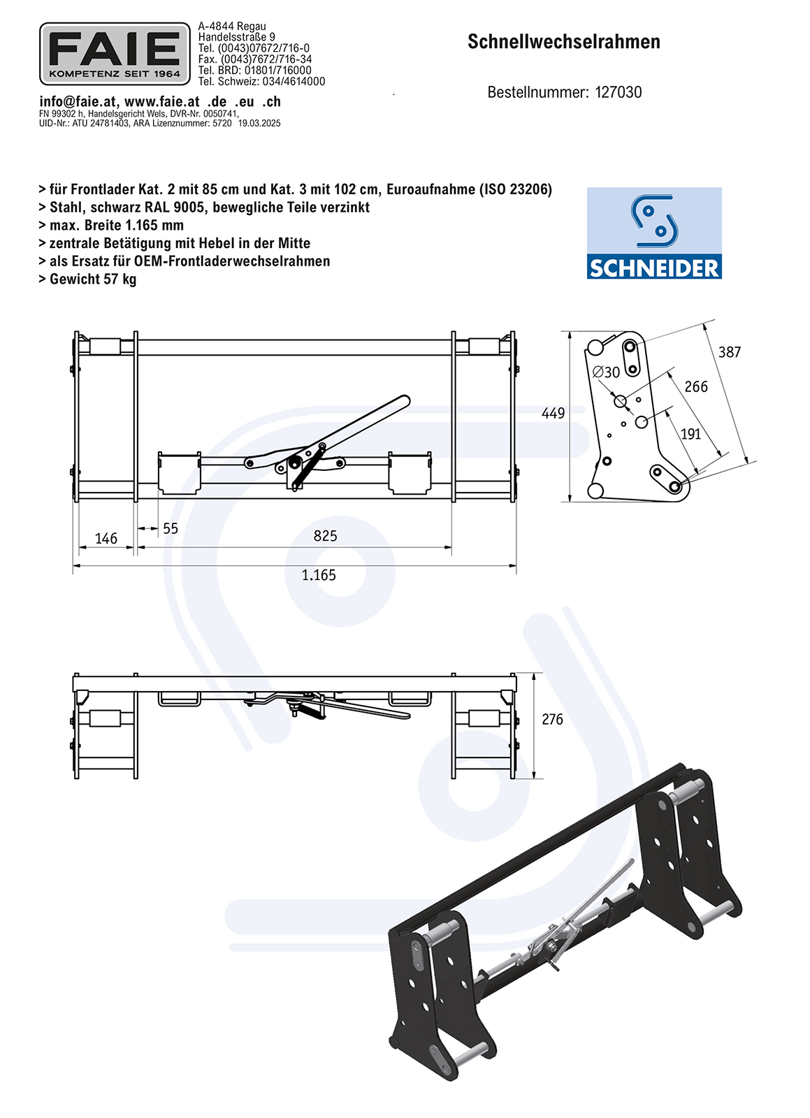 Einfaches und schnelles An- und Abkuppeln für Arbeitsgeräte am Frontlader der Kategorie 2 (85 cm) und 3 (102 cm). Die oberen Aufnahmebolzen ermöglichen durch Umstecken eine individuelle Kippwinkelverstellung. Weiters verfügt der Schnellwechselrahmen über eine mechanische Zentralverriegelung. Aufnahmebolzen Frontladerseitig 30 mm, Aufnahmewelle geräteseitig 40 mm, Anbaubreite der Frontladerschwinge Innen minimal 855 mm und außen max. 1120 mm, Verriegelungsbolzen-Ø 20 mm, Gesamtbreite 1165 mm, Gewicht 57 kg. Bei einem Lastschwerpunkt von 800 mm beträgt die Tragkraft ca. 3000 kg. Der Schnellwechselrahmen ist als Ersatz für OEM-Frontladerwechselrahmen geeignet.