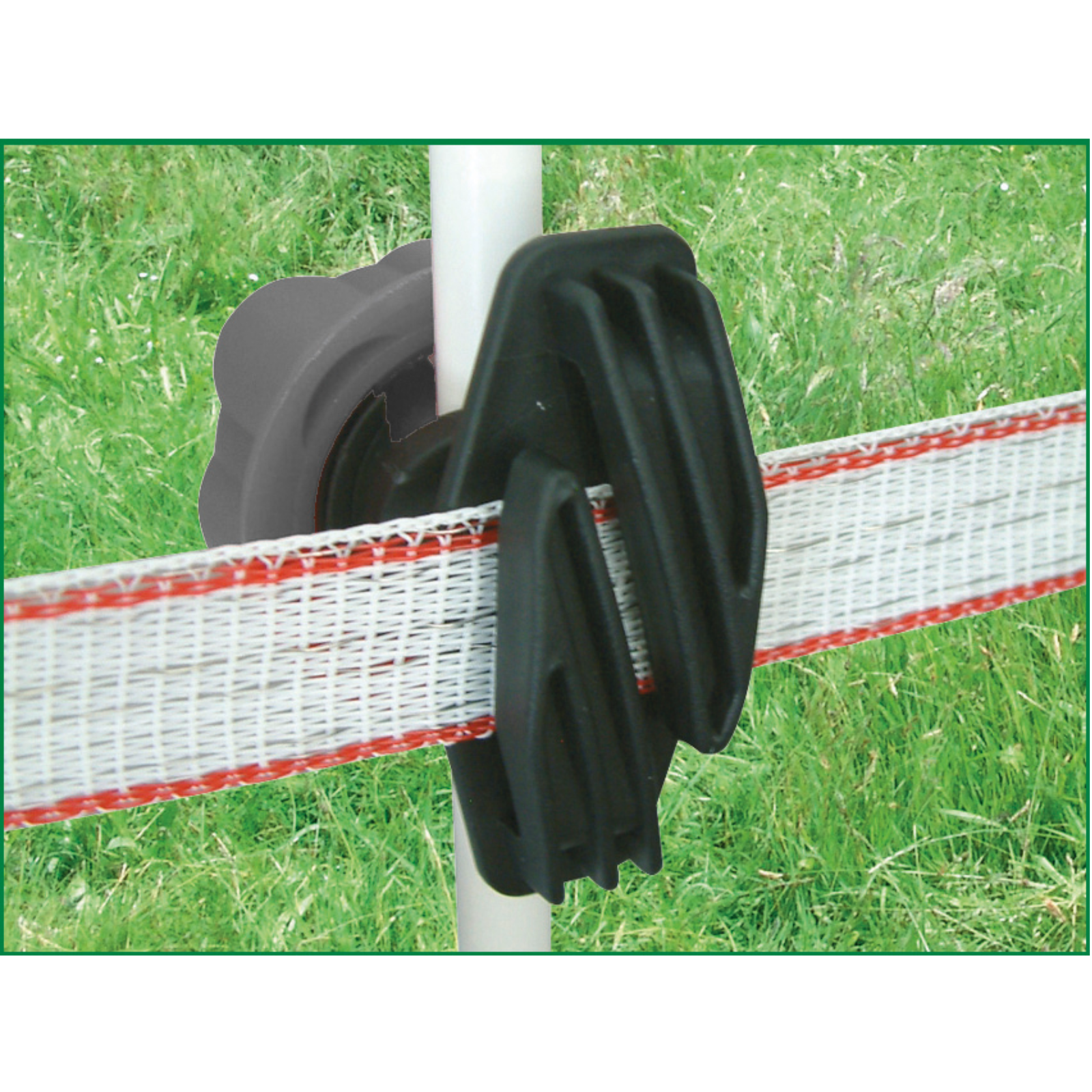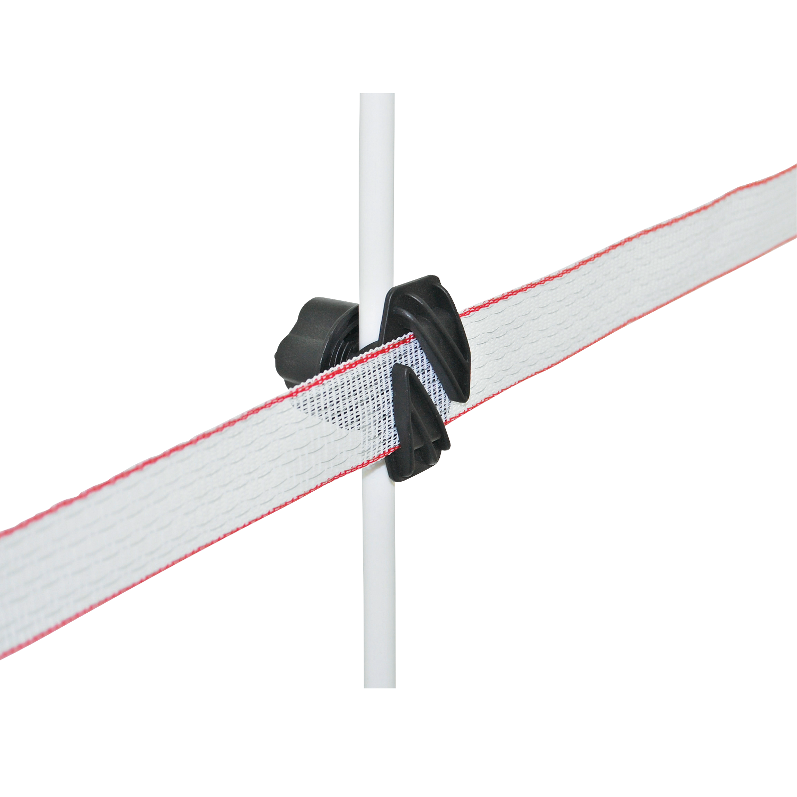 Klemmisolator mit Schraubgewinde für Metall- oder Kunststoffpfähle von 6bis 17 mm Ø.Anwendung: seitlich aufstecken und festdrehen.Für Bänder bis 40 mm. Pack = 10 Stk.