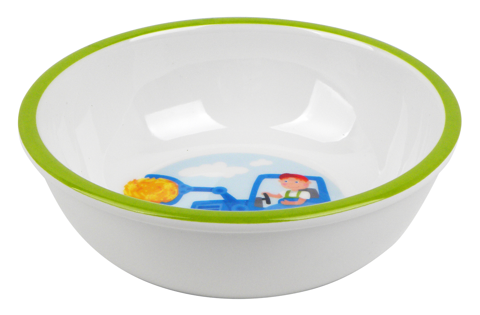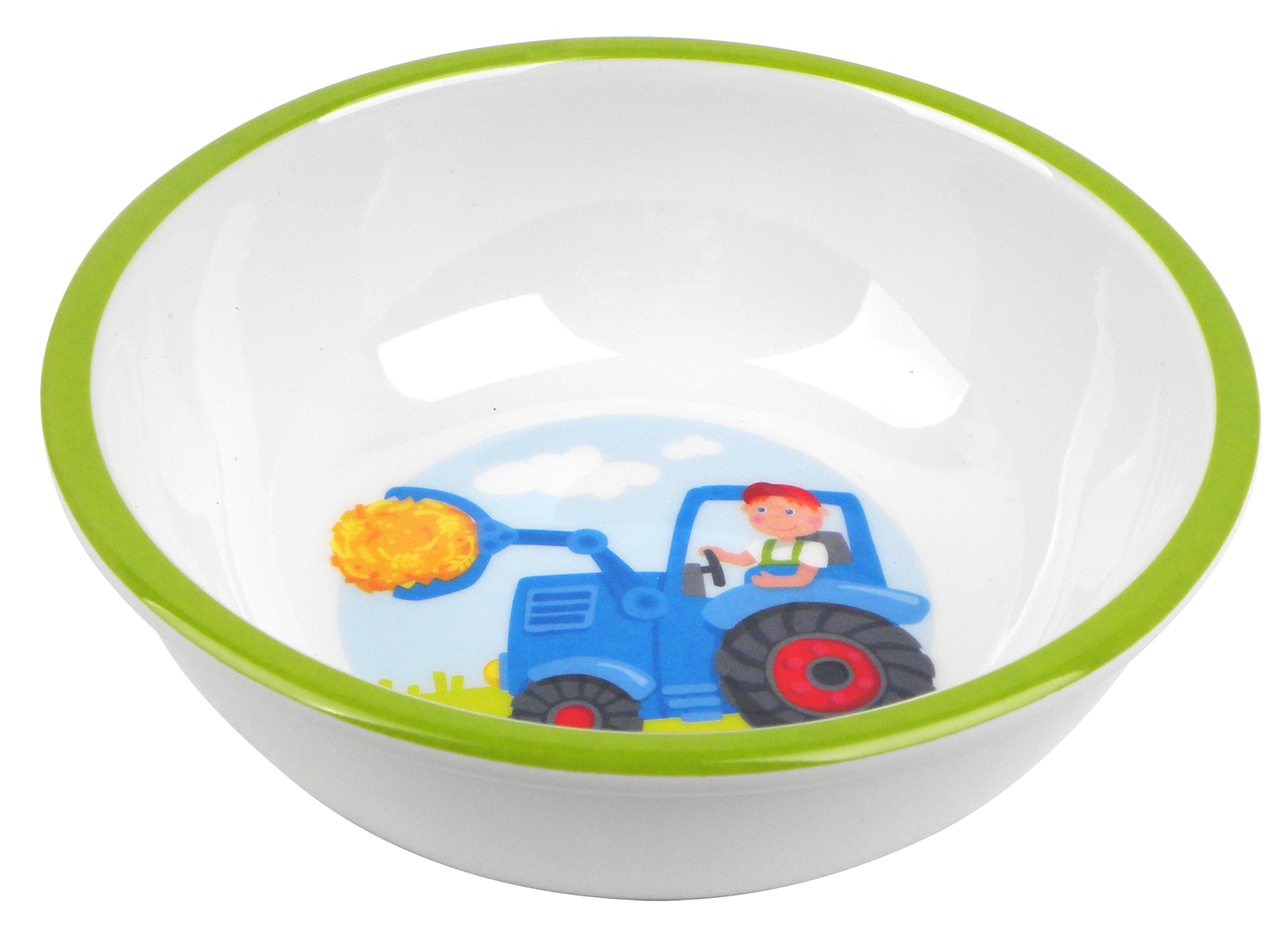 Kinderschüssel Ø 14,5 cm/ Höhe ca 5 cm, aus Melamin für Kinder ab 6 Monaten. Rutschfest dank Gummiring! Dekor TraktorDamit wird jede Mahlzeit zum Vergnügen. Ist Schüssel einmal leer gegessen, gibt es viel für Traktorfans zu sehen! Danach geht's ab in die Spülmaschine, damit die pflegeleichte Kinderschüssel aus robustem Melamin schnell wieder bereit für die nächste Mahlzeit ist. Der hohe Rand erleichtert das Löffeln und ein Gummiring sorgt dafür, dass sie gut am Tisch steht und nicht verrutscht. So unterstützen sie Kinder bei ersten Löffel-Experimenten. Die Melamin-Schüssel Traktor ist ein liebevoll gestaltetes Kindergeschirr aus der HABA-Serie für Kinder ab 6 Monaten.HinweiseMelamingeschirr ist ein Essgeschirr, kein Kochgeschirr und sollte in Verbindung mit Lebensmitteln nur Temperaturen bis max. 70°C ausgesetzt werden. Nicht geeignet zum Speisen erwärmen in der Mikrowelle und dem Backofen!Melamingeschirr ist:• äußerst bruchsicher & stabil• besonders leicht• praktisch für Küche, Haushalt und Outdoor-Aktivitäten• spülmaschinengeeignet bis 50°C• bei richtiger Handhabung (hitzebeständig bis 70°C) gesundheitlich unbedenklichKurz erklärt:Das liebevoll gestaltete Melamin-Geschirr bringt beim Auslöffeln für Traktorfans jede Menge zu sehen zum VorscheinDie Kinderschüssel aus Melamin ist robust und pflegeleicht und ideal für jeden TagDer hohe Schüsselrand erleichtert den Kleinsten das erste LöffelnDank Gummiring an der Unterseite steht die Schüssel sicher am Tisch, ohne zu verrutschenDas Kindergeschirr ist spülmaschinengeeignet und damit perfekt für den bewegten Kinderalltag
