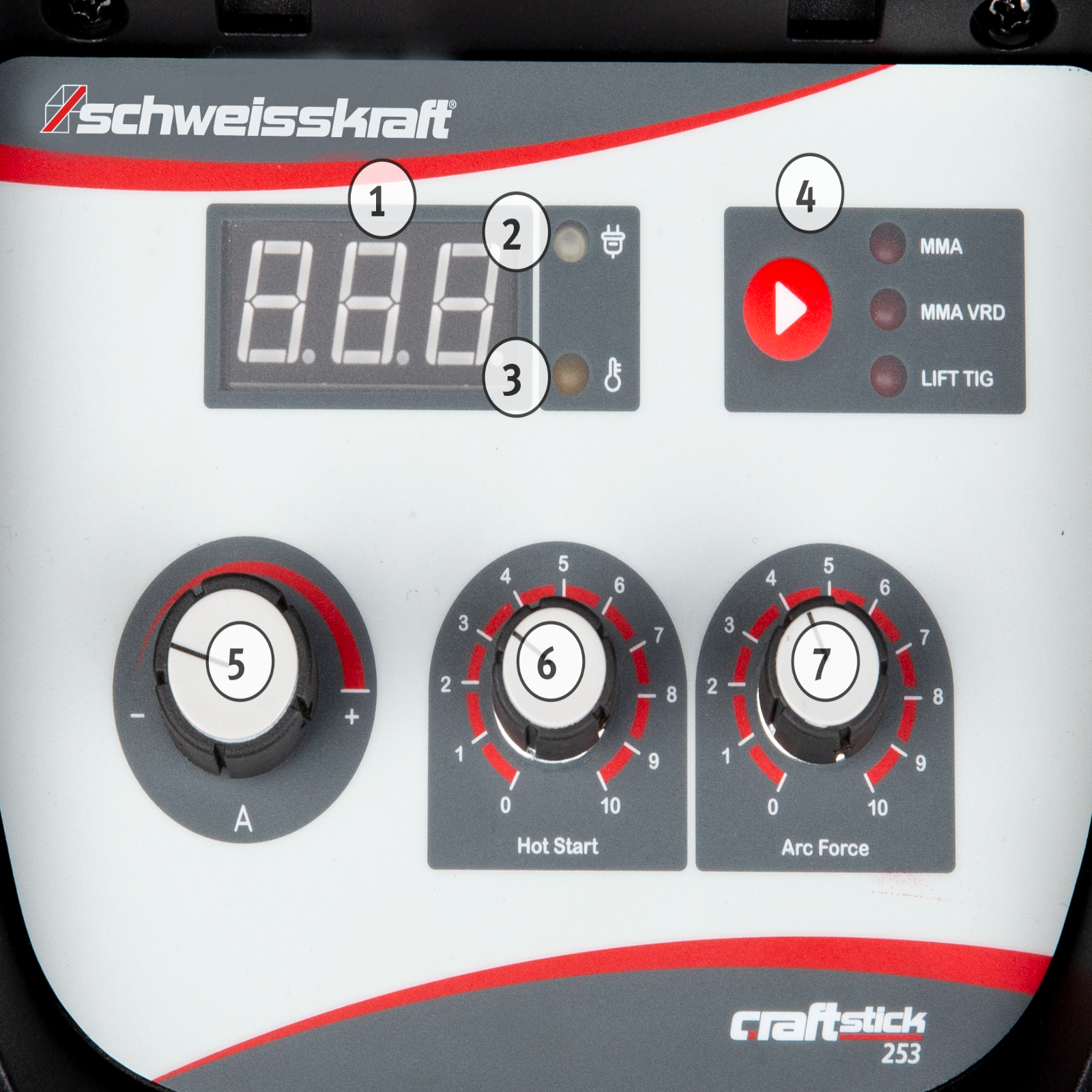 Arc-Force-Regelung: Durch die interne Überwachung von Schweißstrom und Schweißspannung werden Kurzschlüsse schnell und sicher aufgelöst. Durch die einstellbare Anhebung des Stroms wird der Lichtbogen stabilisiert und die Elektrode kann problemlos verarbeitet werden