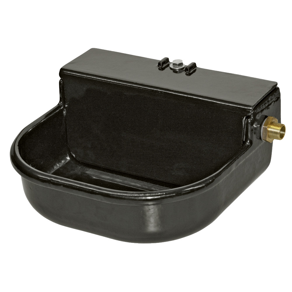 Tränkeschale aus Grauguss, emailliert. Beckenvolumen 3 Liter, hochwertige, emaillierte Oberfläche. 1/2 Zoll Anschluss (von rechts und links möglich), Wasserdurchfluss ca. 6,5 l/min bei 2-3 bar. Lieferung mit Schwimmerventil.