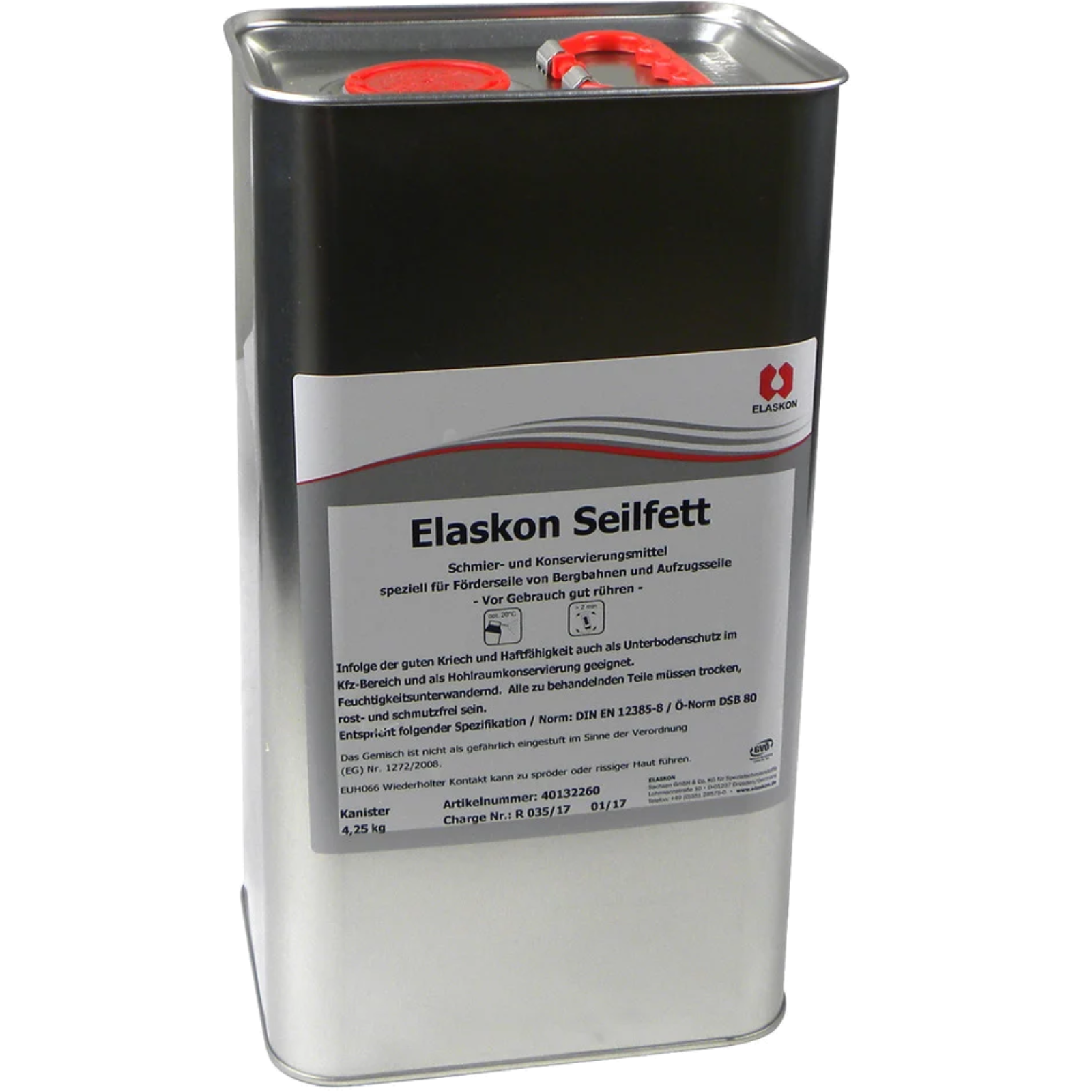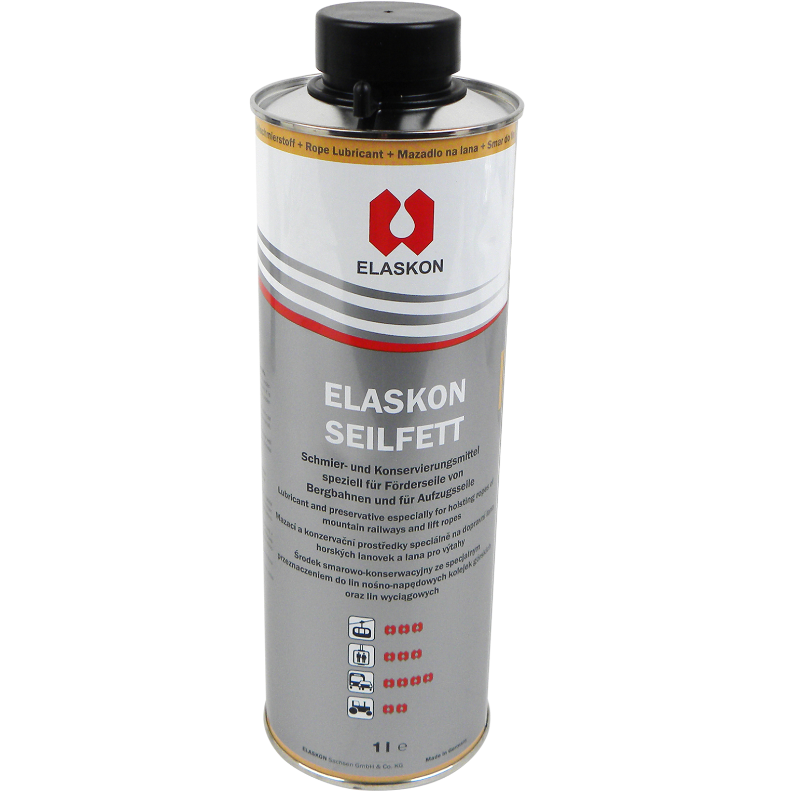 Schmiermittel speziell für Förderseile von Bergbahnen und Aufzügen,sehr gute Kriech- und Haftfähigkeit, konserviert, feuchtigkeitsunterwandernd,auch als KFZ-Unterbodenschutz und Hohlraumschutz geeignet.gezielte Anwendung, kein Sprühnebel, optimaler Korrosions- und Rostschutz,feuchtigkeitsunterwandernd, streich- und sprühbar,1 Liter Gebinde mit Aufnahme für Sprühpistole.