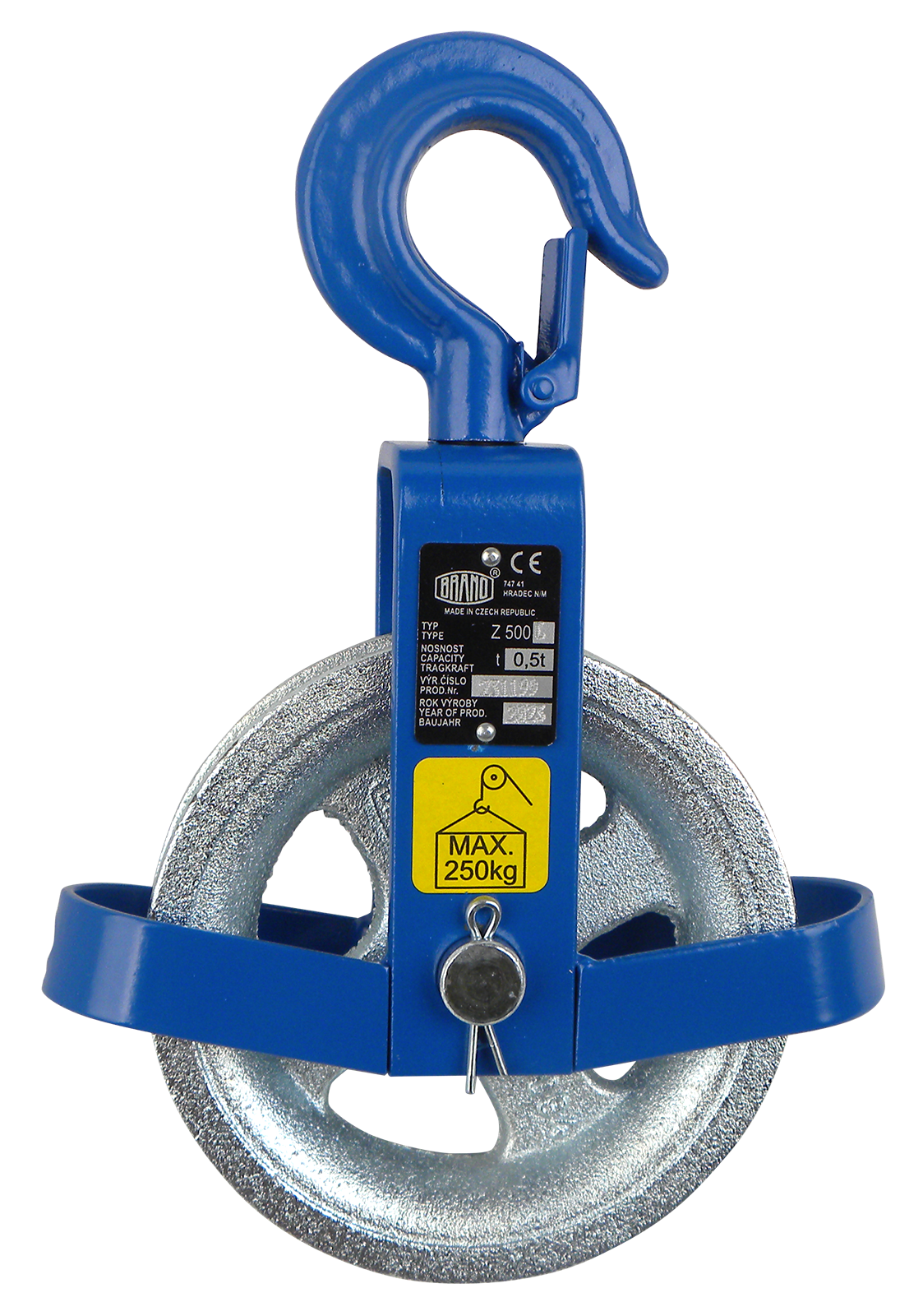 Rollen-Ø 125 mm, Tragfähigkeit 500 kg, Umlenkseilrolle mit drehbarem Sicherheitshaken bzw. Öse und Seilführungsbügel.