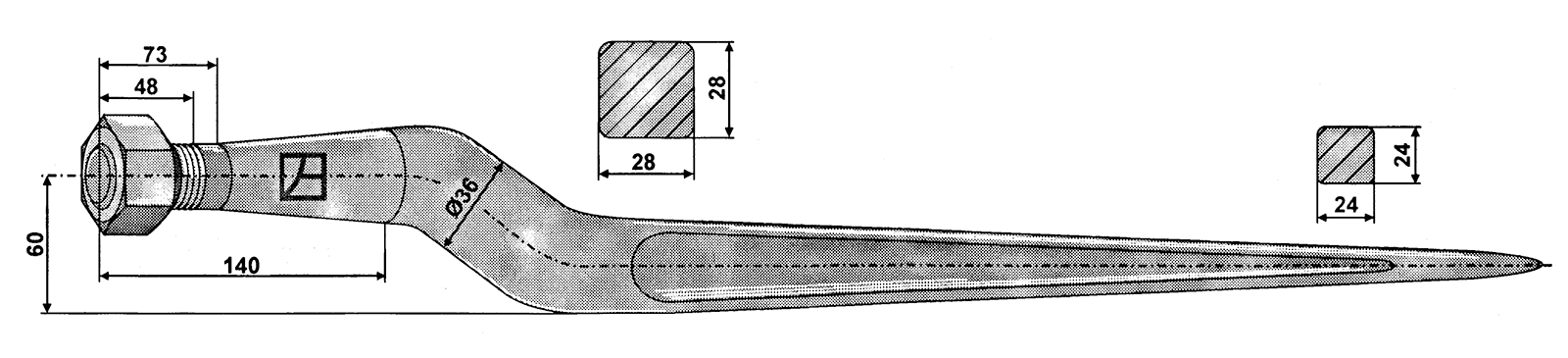Gekröpfter Silozinke in der Länge von 810 mm und Vierkantprofil. Die konische Mutter M22x1,5 mm ist im Lieferumfang enthalten.