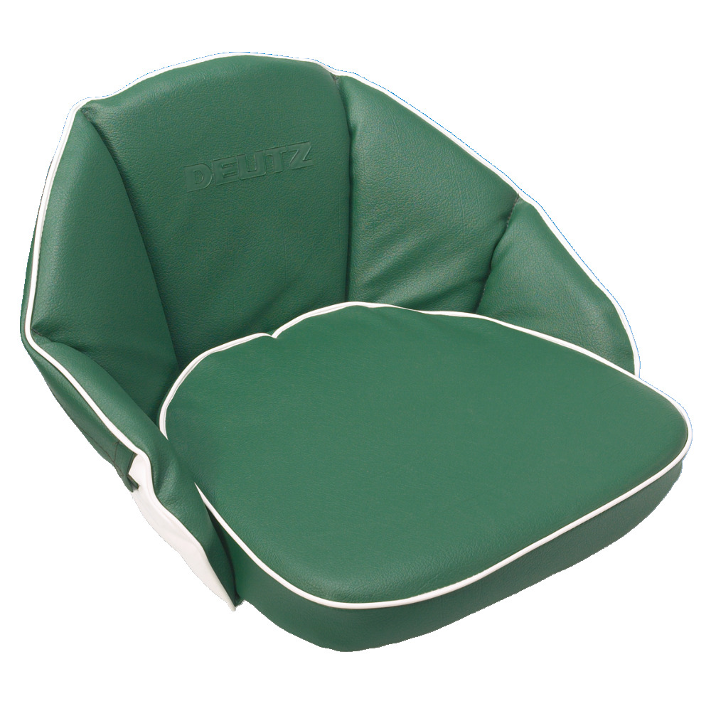 Grün, Lehnenhöhe 32 cm. Sitzfläche 44 x 42 cm, hochwertiger Kunstlederbezug, Polsterung und umlaufendes Gummiband zur Befestigung. Schriftzug passend zum Traktor/Schlepper eingeprägt.
