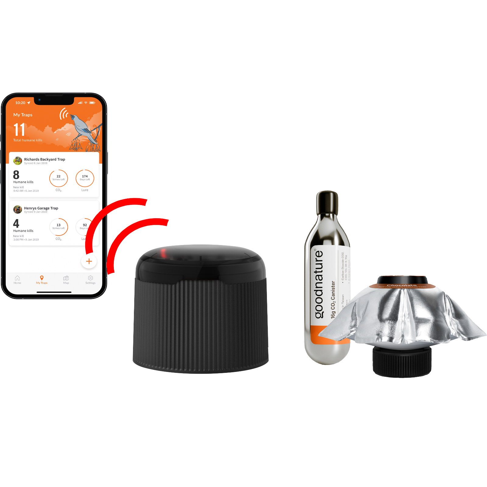 Außerdem können Sie in der App für jede Falle sehen, wie lange die CO2-Patrone und der Lockstoff reichen. Im Lieferumfang sind eine CO2-Patrone und eine gefüllte Lockstoff-Pumpe enthalten.