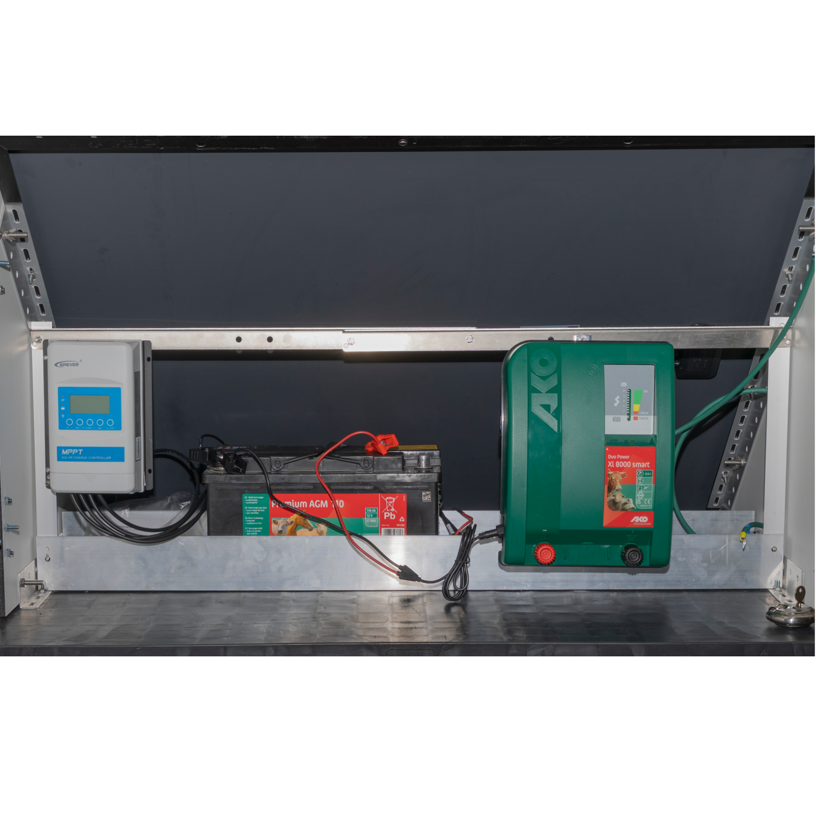 Komplette Solarstation. Ideal für große Weiden ohne Stromanschluss oder auf der Alm. Die komplette Anlage wird fertig montiert auf einer Palette geliefert und muss nur noch mit der Erdung und dem Zaun verbunden werden.