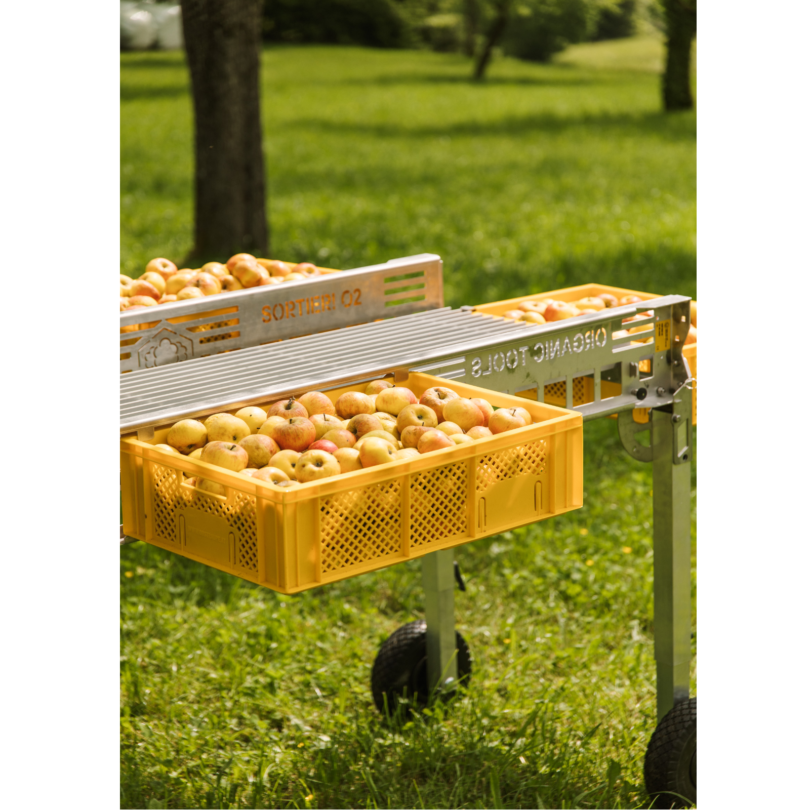 Das Sortier!02 mit Streben aus eloxiertem Aluminium ist der beste Freund der Obstraupe. Aufgesammeltes Obst oder Gemüse wird aus der Kiste auf den Sortiertisch geleert und kann in idealer Arbeitshöhe noch am Feld oder bei der Hofstelle nachsortiert werden.