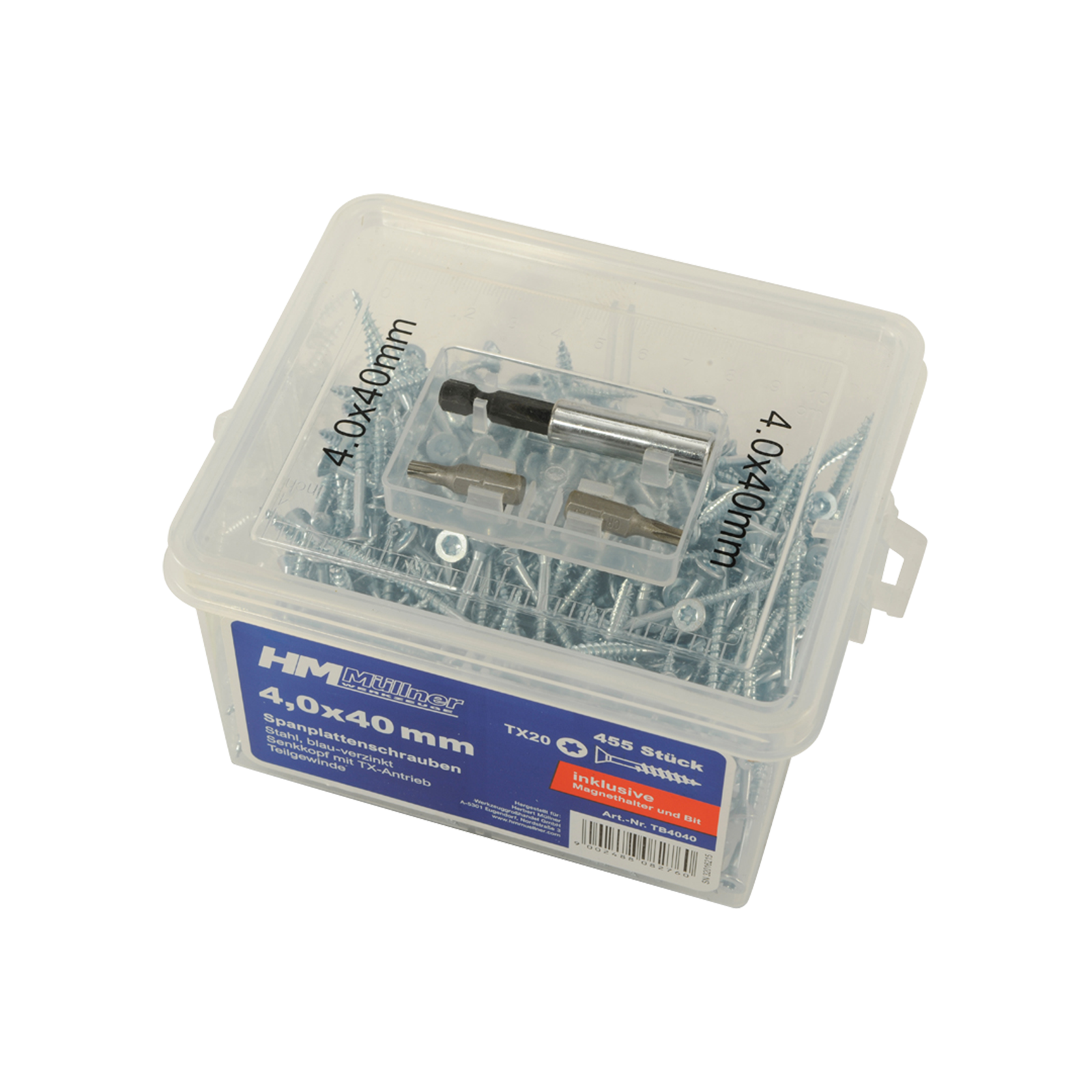Hochwertige Universalschrauben mit Torx Antrieb, praktische Kunststoffbox mit Halterung und 2 passenden Bits.