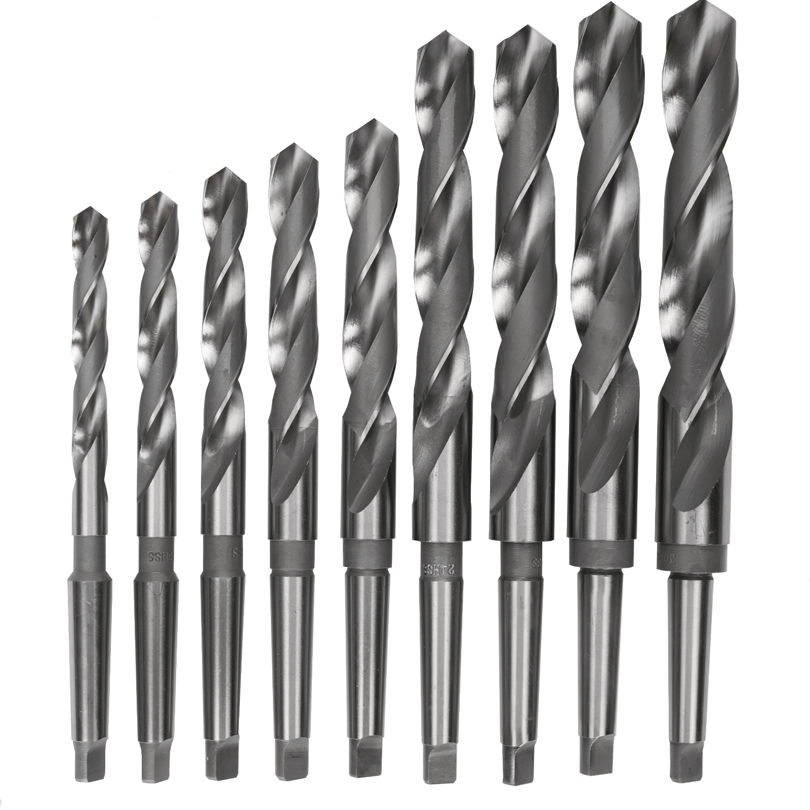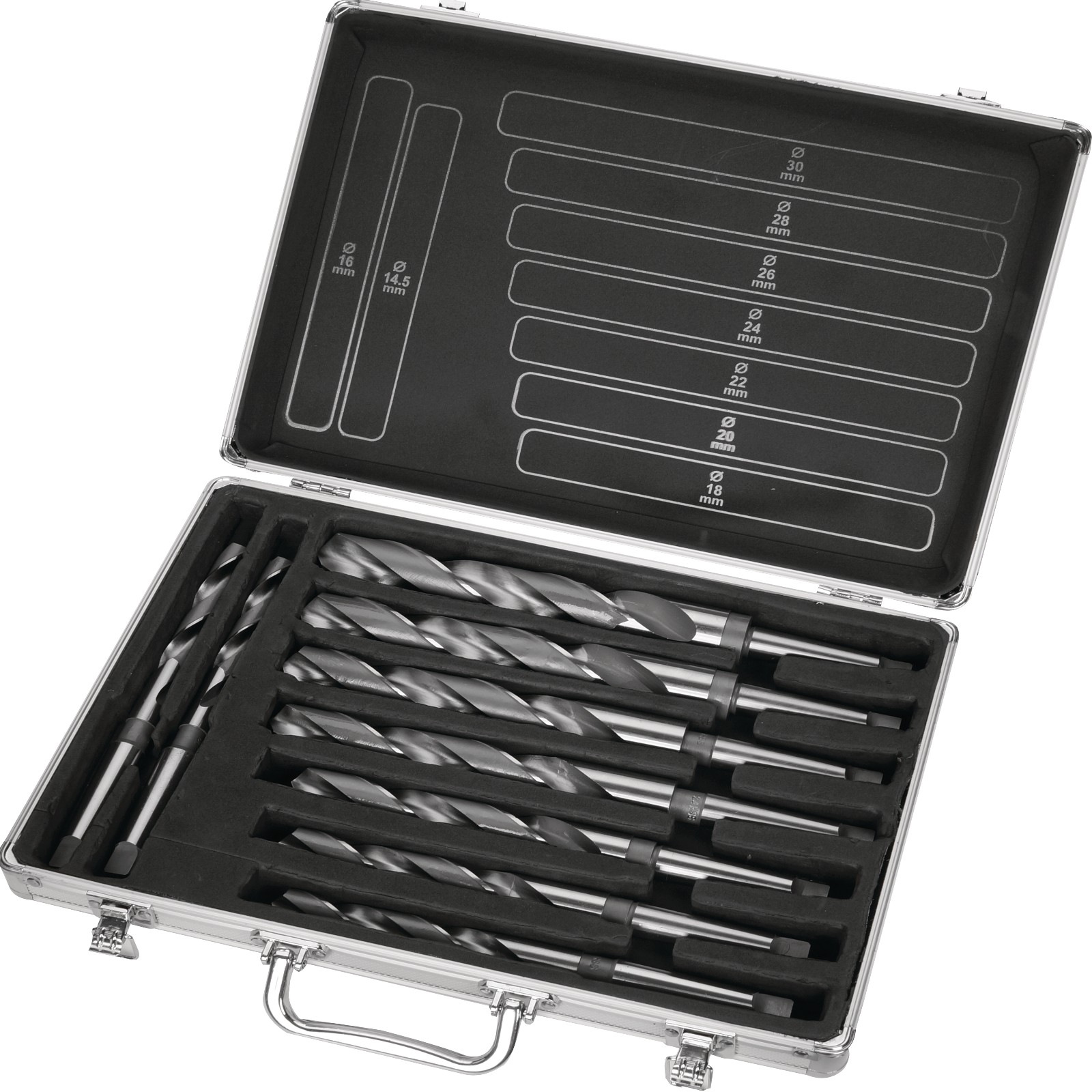 HSS-Metallbohrer mit Konus-Aufnahme für den Einsatz in Ständerbohrmaschinen, Drehmaschinen usw.Inhalt: je ein Bohrer: 14,5/16/18/20/22/24/26/28/30 mm.Lieferung in Metallkassette.