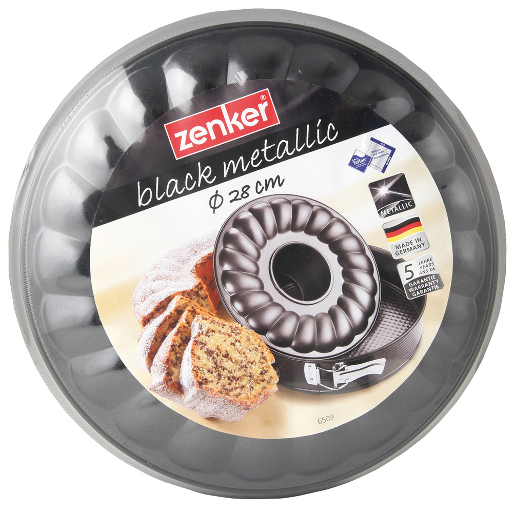 Springform mit Flach- und Rohrboden Black Metallic, Stahlblech mit Antihaftbeschichtung/Teflon Classic, Springform-Ring mit Rillenprägung für besondere Stabilität, Antihaftbeschichtung für einfaches Entformen, leichte Reinigung per Handwäsche, 5 Jahre Garantie, Made in Germany.