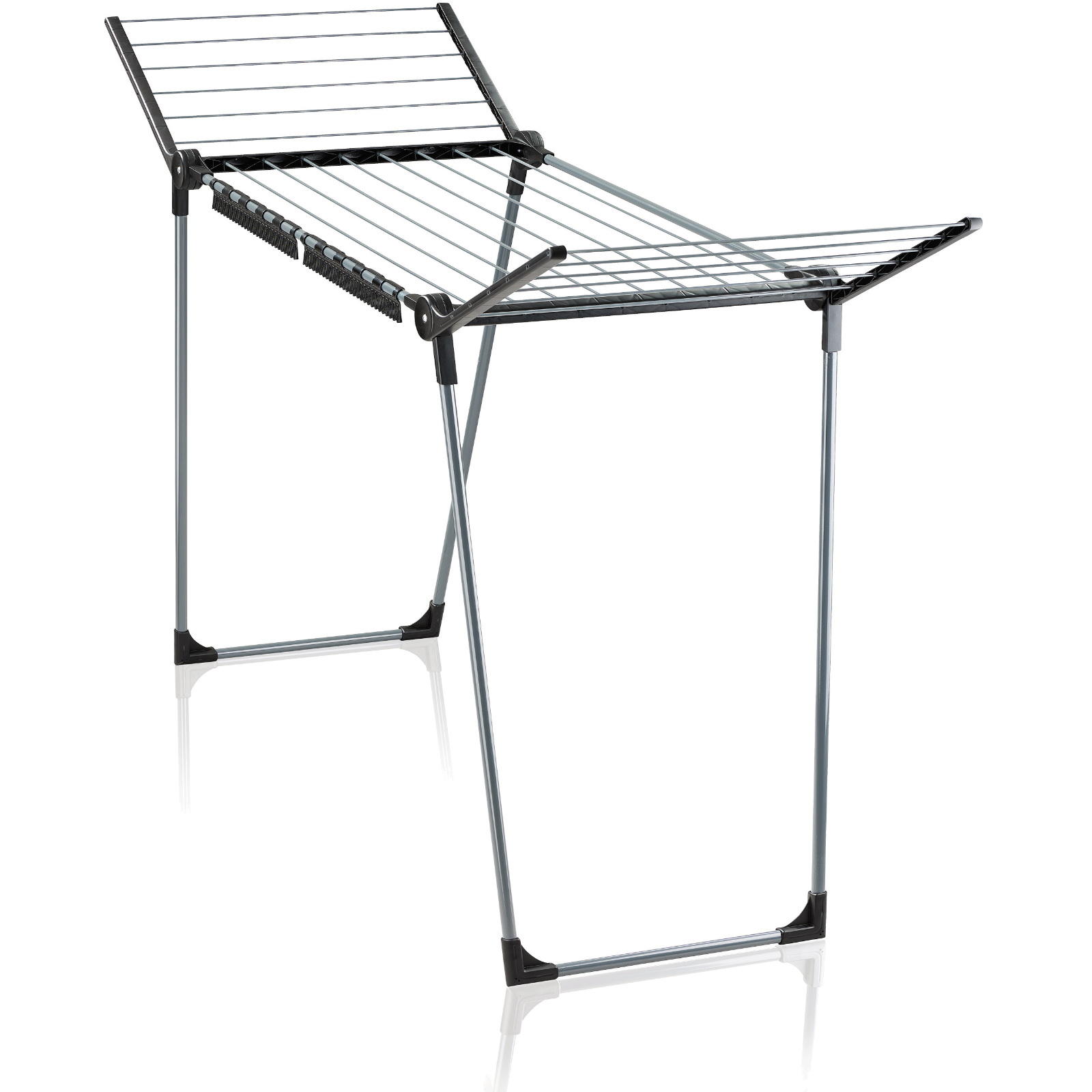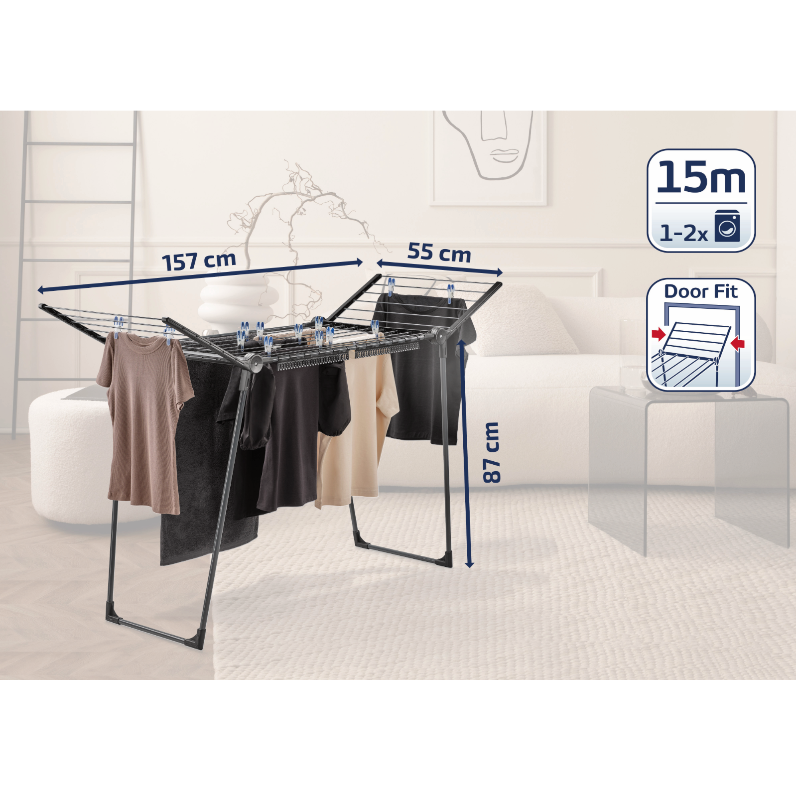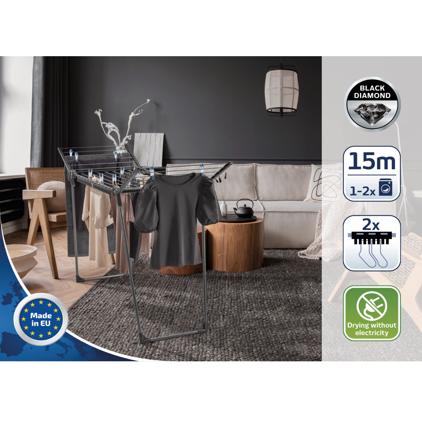 Mit einer Tiefe von nur 55 cm passt er selbst in schmale Räume und überzeugt durch das elegante „Black Diamond“-Design mit schwarzen und anthrazitfarbenen Trockenstangen.Seine parallel angeordneten Beine sorgen für Stabilität, egal ob in der Wohnung, auf dem Balkon oder im Garten.Der Standtrockner ist funktional und passt durch jede Tür.Dank ausklappbarer Flügel bietet er eine Trockenlänge von 15 m, ideal für große Wäschestücke oder bis zu zwei Waschmaschinenladungen.Der Pegasus 150 Solid Slim ermöglicht nachhaltiges und energieeffizientes Wäschetrocknen ohne Strom.Praktisch sind auch die zwei schwarzen Kleinteilehalter, in die Unterwäsche oder Socken einfach hineingeschoben werden können – Wäscheklammern sind nicht nötig.Die Maße des Wäscheständers betragen 87 x 157 x 55 cm. Er lässt sich mit wenigen Handgriffen zusammenklappen und platzsparend verstauen.