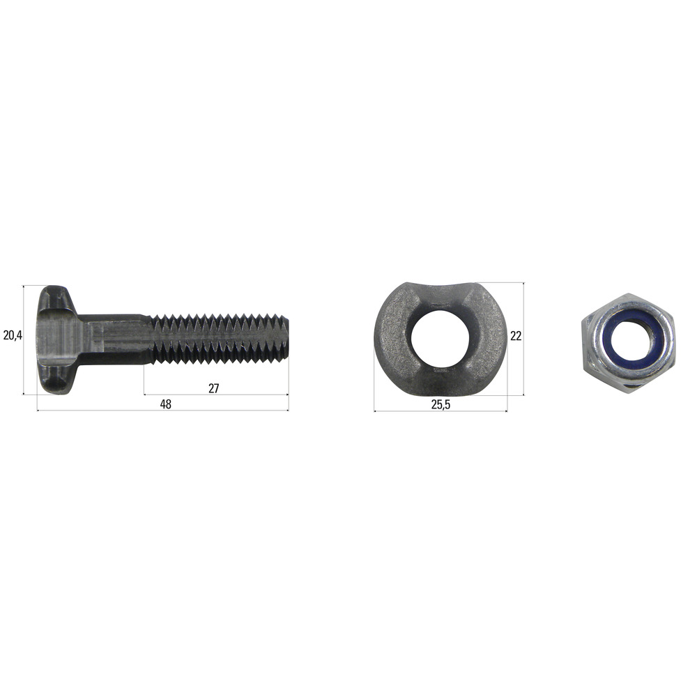 Steckschraubengarnitur M10x48 passend zu Kratzbodenkette 9x27, 9,5x27, 10x28. Passend zu Ladewagen und Streuer von Bergmann. Die Kettenschraubengarnitur besteht aus Kettenschraube, Druckstück und Sicherungsmutter.