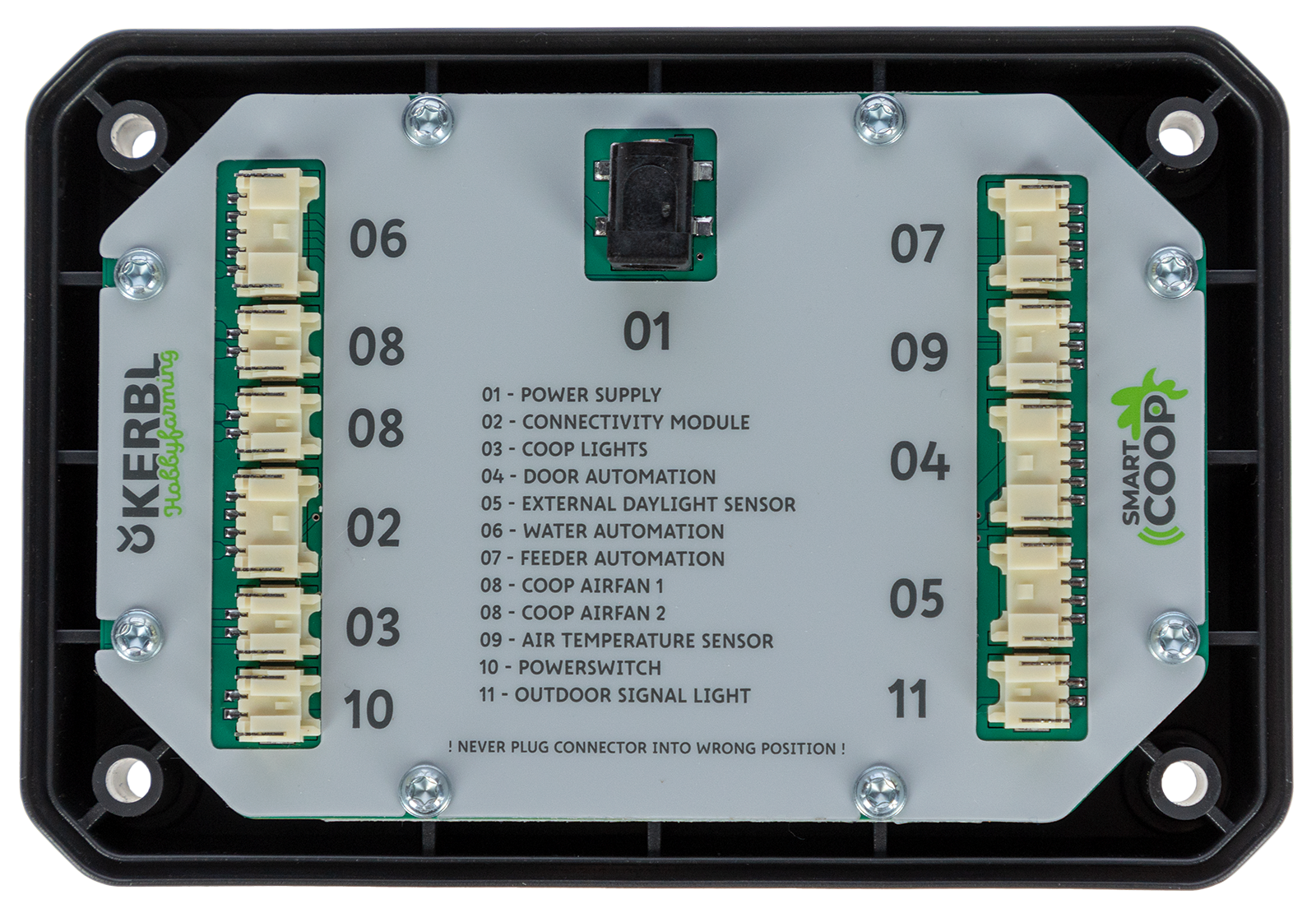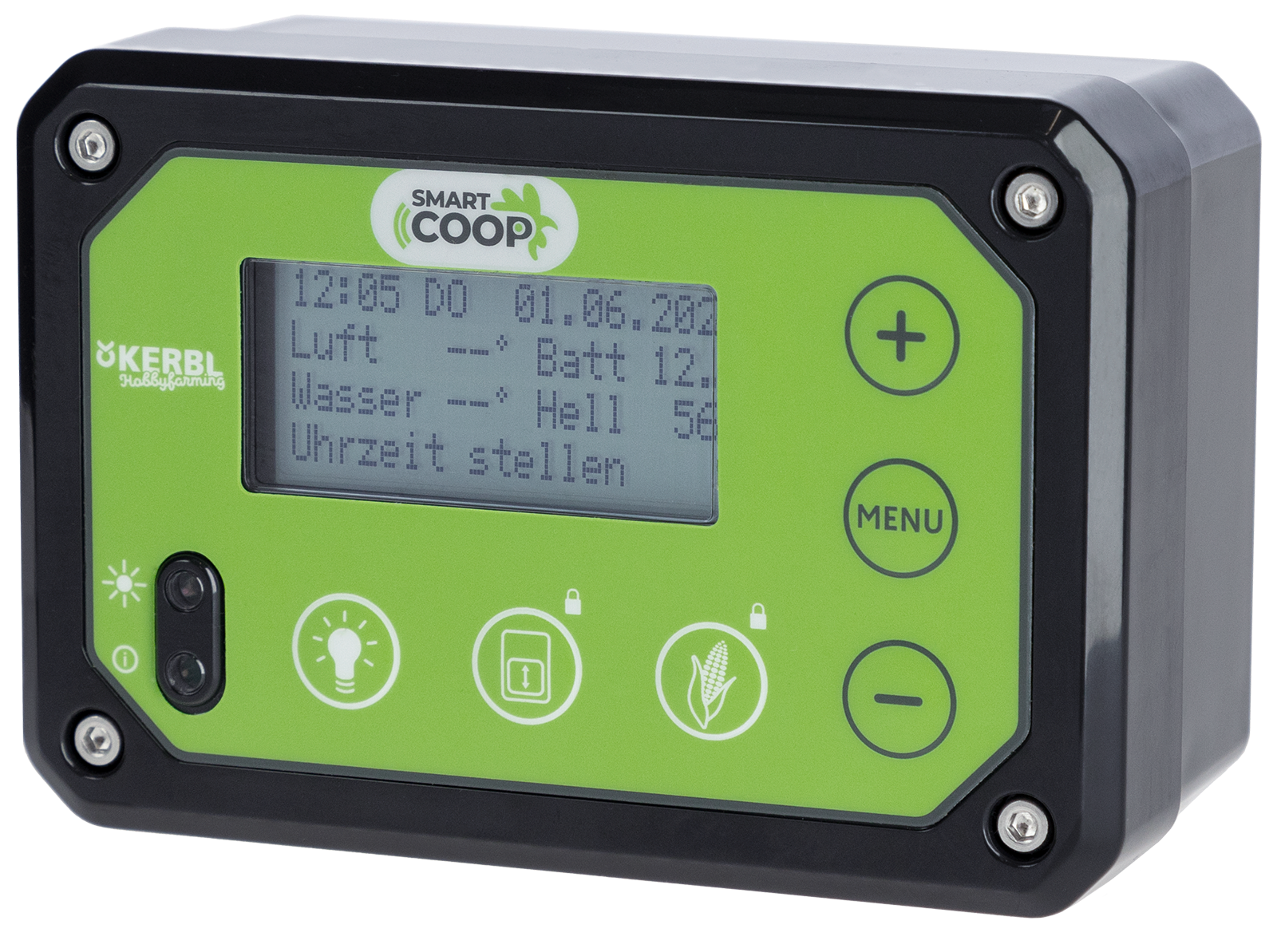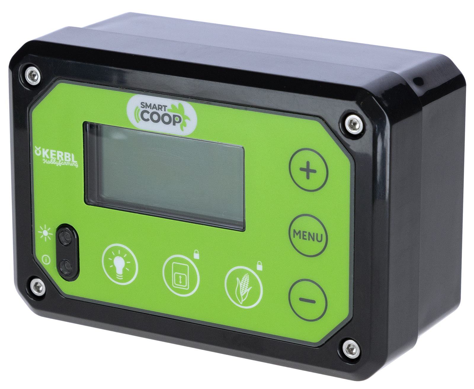 Die Steuerung ist das Herzstück des SmartCoop-Systems. Alle Module werden mit der Steuerung verbunden und programmiert. Betriebsspannung 12 V. Anschluss 230 V.