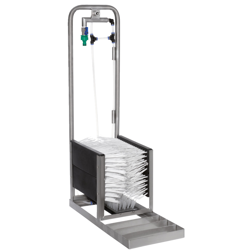 Chassis aus Voll Edelstahl. Der Stiefelreiniger wird direkt an die Wasserleitung angeschlossen. Durch das Vakuum kann flüssiges Reinigungsmittel angesaugt werden. Dieses wird über 5 Nylon Bürsten automatisch verteilt. Maße 90x26x55 cm.