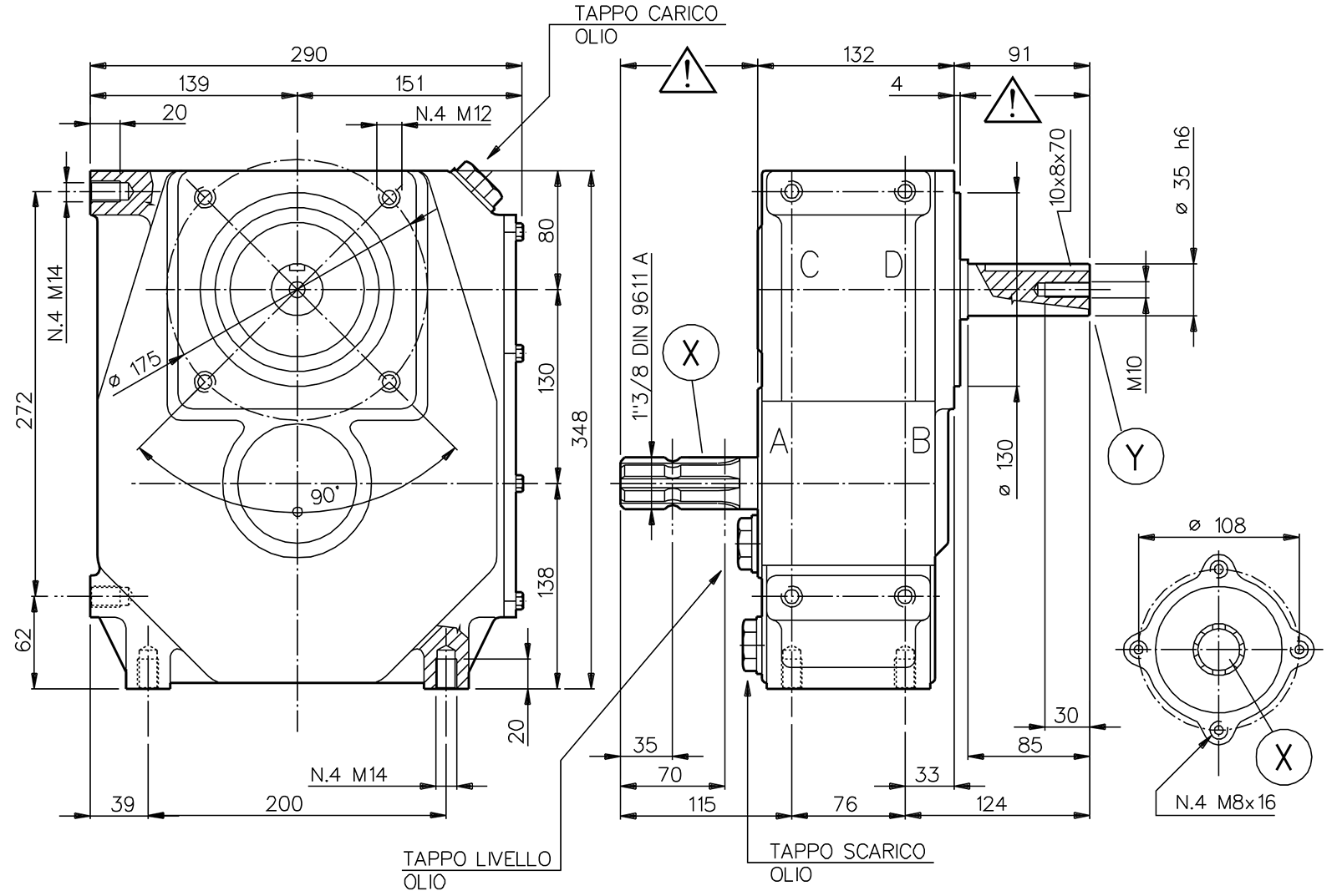 Für verschiedene Anwendungsarten speziell in der Landwirtschaft. Geringe Abmessungen und geringes Gewicht. Einfache Wartung. Die Getriebe werden ohne Ölfüllung ausgeliefert. Allgemeine technische Daten:Anschluss Eingang: 1 3/8 ZollAnschluss Ausgang: Ø 35 h6Drehrichtungsumkehr: jaIm allgemeinen führen Drehmomentspitzen bis zum 2-fachen des Nenndrehmoments zu keiner Beschädigung der einzelnen Getriebebauteile. Vollständige Unversehrtheit kann jedoch nur durch eine geeignete Sicherheitsvorrichtung gewährleistet werden.