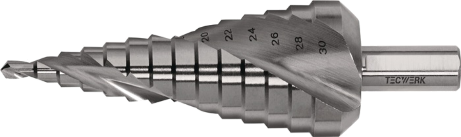 Produktinformationen "Stufenbohrer Bohrbereich 4-30 mm HSS spiralgenutet Schneidenanzahl 2 Stufenanzahl 14"