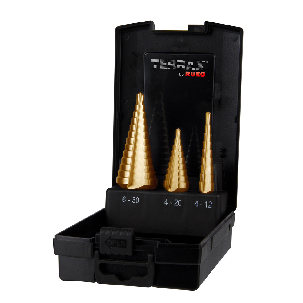 3-teiliger Stufenbohrersatz in ABS Kunststoffkassette für das Bohren von Löcher in Kunststoff, Aluminium, Messing und Stahl bis 4,0mm Materialstärke. Inhalt: je ein Stufenbohrer 4-12 mm, 4-20 mm und 6-30 mm Bohrbereich. Alle Bohrer in hochwertiger HSS-TiN Ausführung.