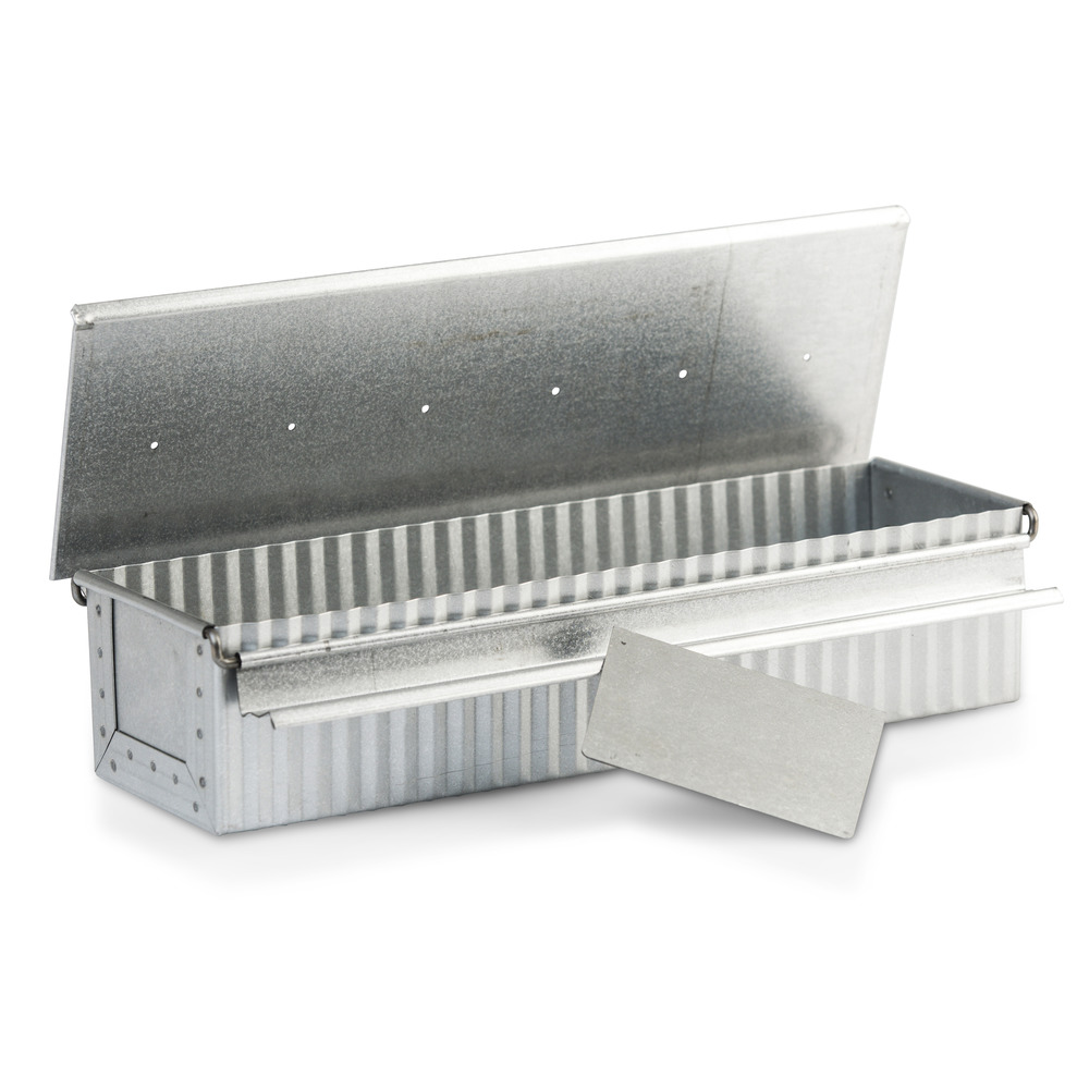 Toastbrotform aus aluminierten Stahlblech mit aufklappbarem Deckel.