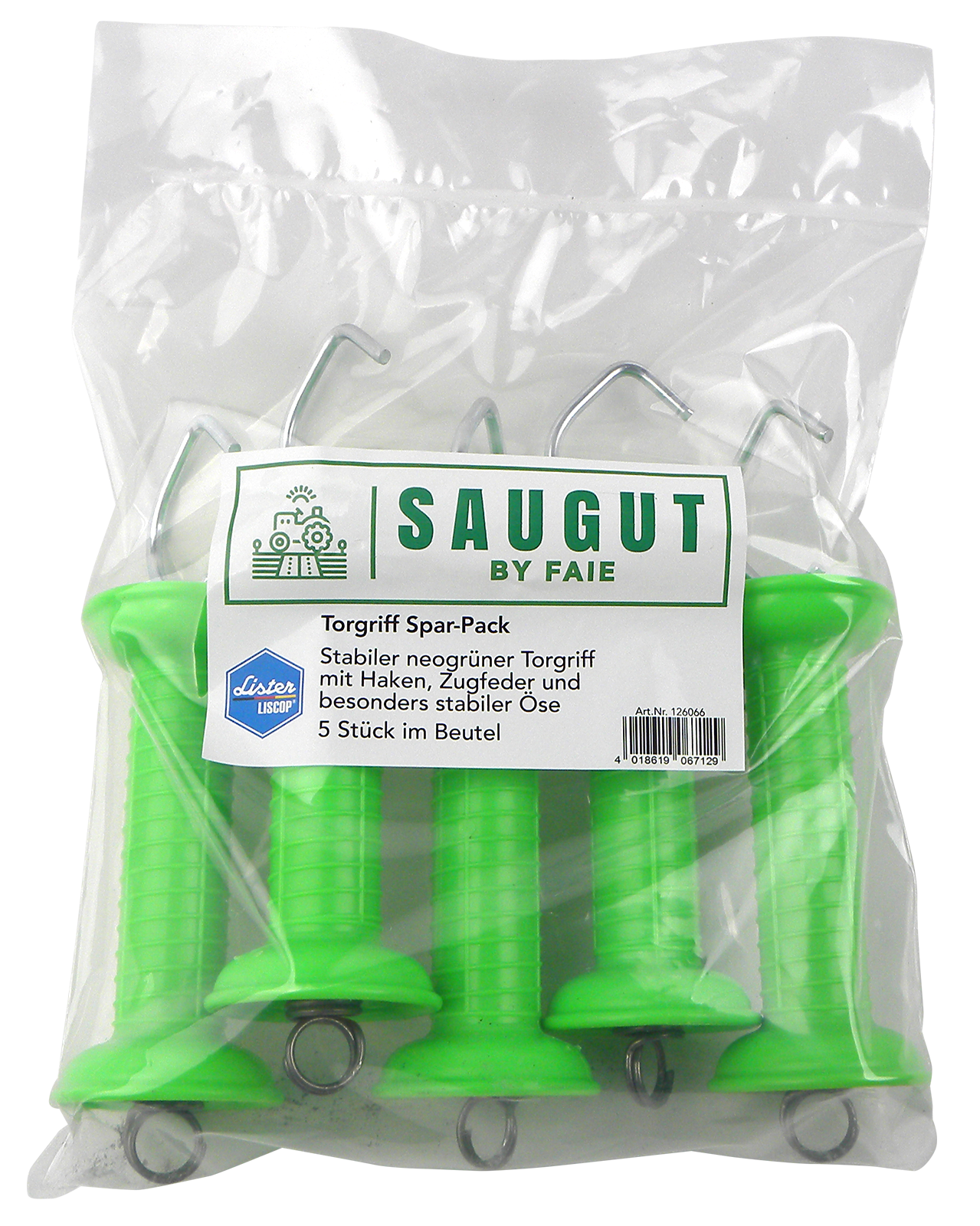 5 stabile neongrüne Torgriffe im Spar-Set. Torgriff mit Haken, Zugfeder und Öse.