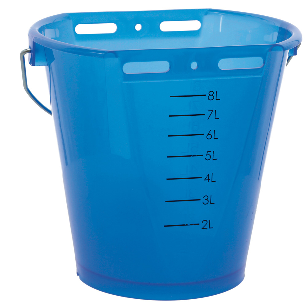 Vorteil: Der Füllstand ist leicht von der Ferne zu erkennen! Mit aufgedruckter Skala auf der Rückseite und zusätzlich einer eingeprägten Skala auf der Innenseite. Mit Metallbügel, säurebeständig, lebensmittelecht und leicht zu reinigen. Ohne Sauger und Ventil. Zu verwenden mit Schraubventilen, FixClip oder Hygieneventilen. Inhalt 8 Liter. Farbe: blau transparent