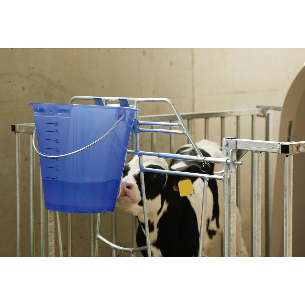 Geeignet für alle Tränkeeimer. Durch die Eimersicherung bleibt der Tränkeeimer beim Saufen in Position und kann nicht nach hinten weggestoßen werden. Geeignet zur Montage an Kälberhüttenzäunen. Verzinkt.