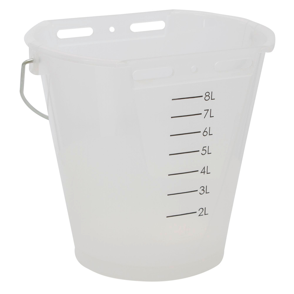 Vorteil: Der Füllstand ist leicht von der Ferne zu erkennen! Mit aufgedruckter Skala auf der Rückseite und zusätzlich einer eingeprägten Skala auf der Innenseite. Mit Metallbügel, säurebeständig, lebensmittelecht und leicht zu reinigen. Ohne Sauger und Ventil. Zu verwenden mit Schraubventilen, FixClip oder Hygieneventilen. Fassungsvermögen 8 Liter. Farbe: weiß