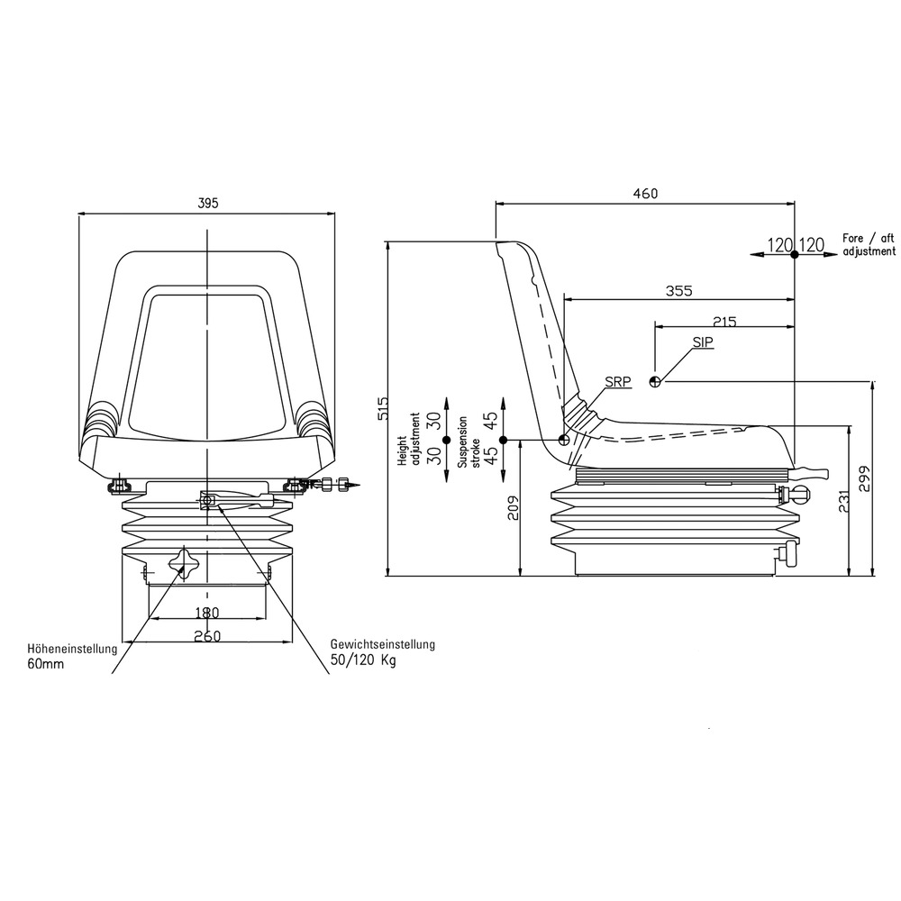 Mit horizontaler Grundplatte: Gewichtseinstellung 50 - 120 kg, mechanische Federung 85 mm mit Gasdämpfer. Längs- und Höhenverstellung, PU-Polsterung. BxHxT: 390 x 530 x 460 mm, Grundplatte BxT: 180 x 300 mm.