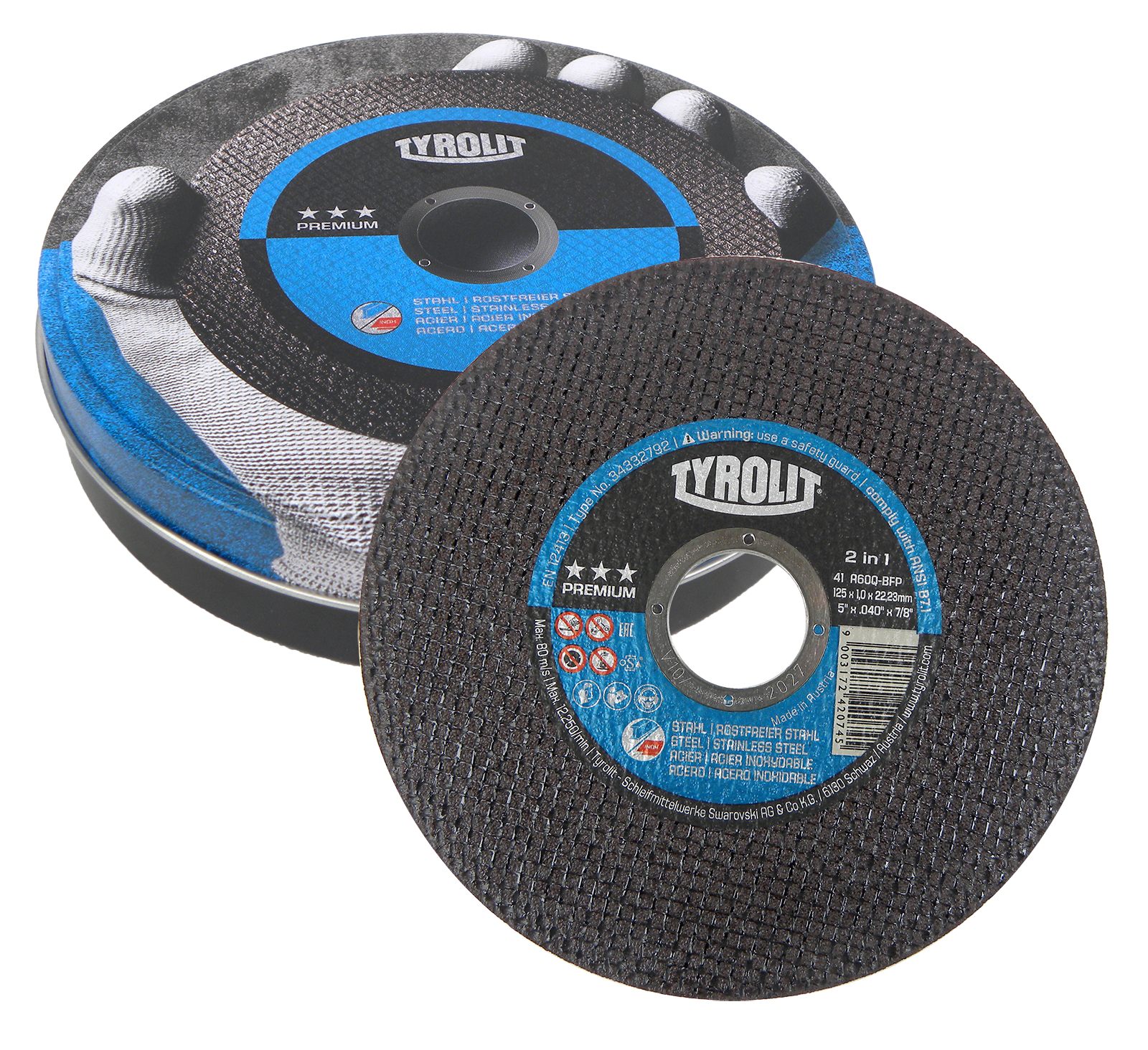 10 Stk. Original Tyrolit Metall-Trennscheibe Premium superdünn 125x1x22,2 mm in praktischer Metallbox.