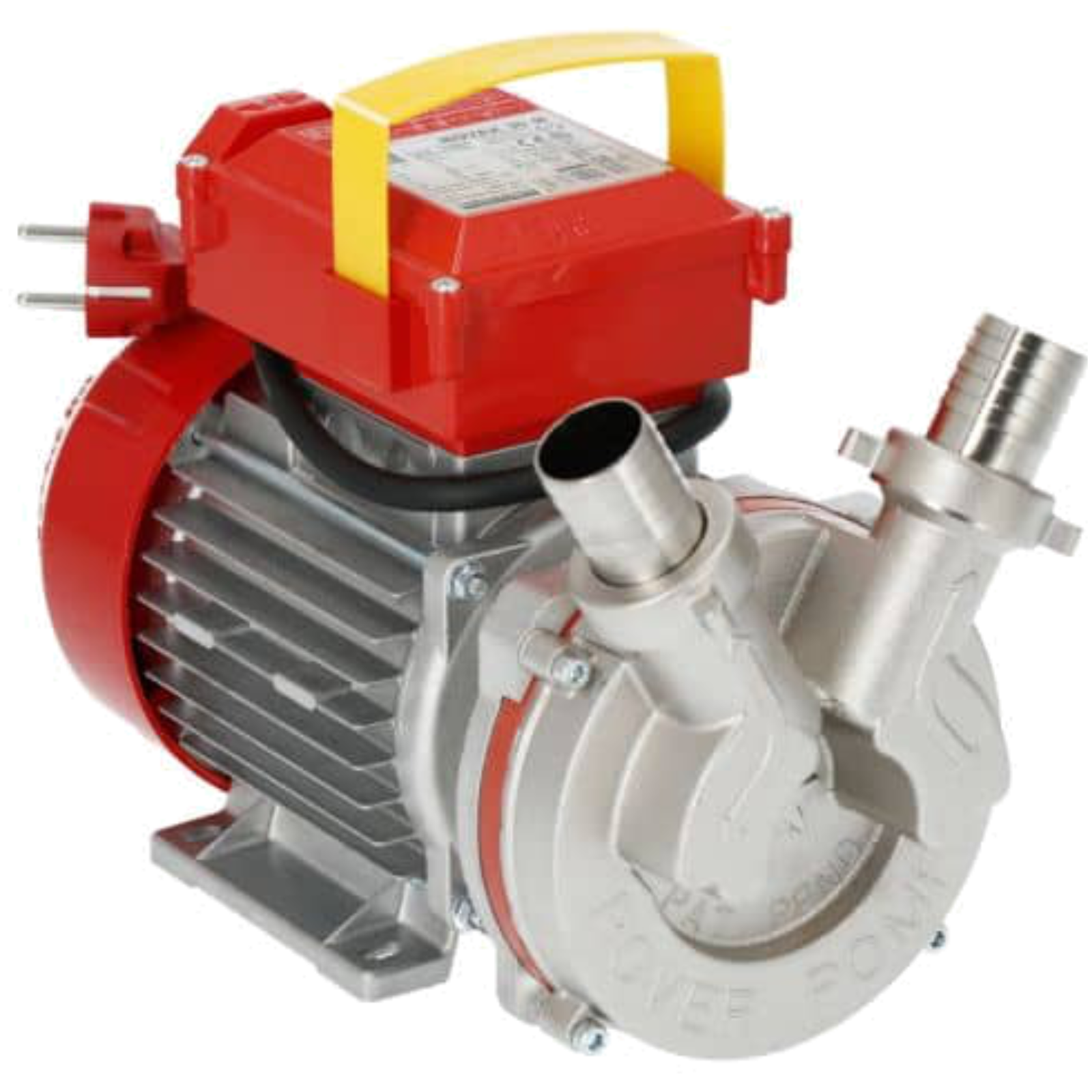 Durchfluss: 5000 l/h, selbstansaugende Flüssigkeitsringpumpe mit Elektromotor, ohne Bypass, Pumpe in 2 Richtungen betreibbar, geeignet zum Fördern von Lebensmittelflüssigkeiten, wie Wasser, Wein, Würze, etc. Mit Standard NBR-Dichtung, Schlauchanschluss 30 mm, Elektrische Anschluss 230 V / 50 Hz, Förderhöhe 15 m, Motor: 650 W / 1,0 PS, 1450 U/min, Maximum Temperatur 35 °C