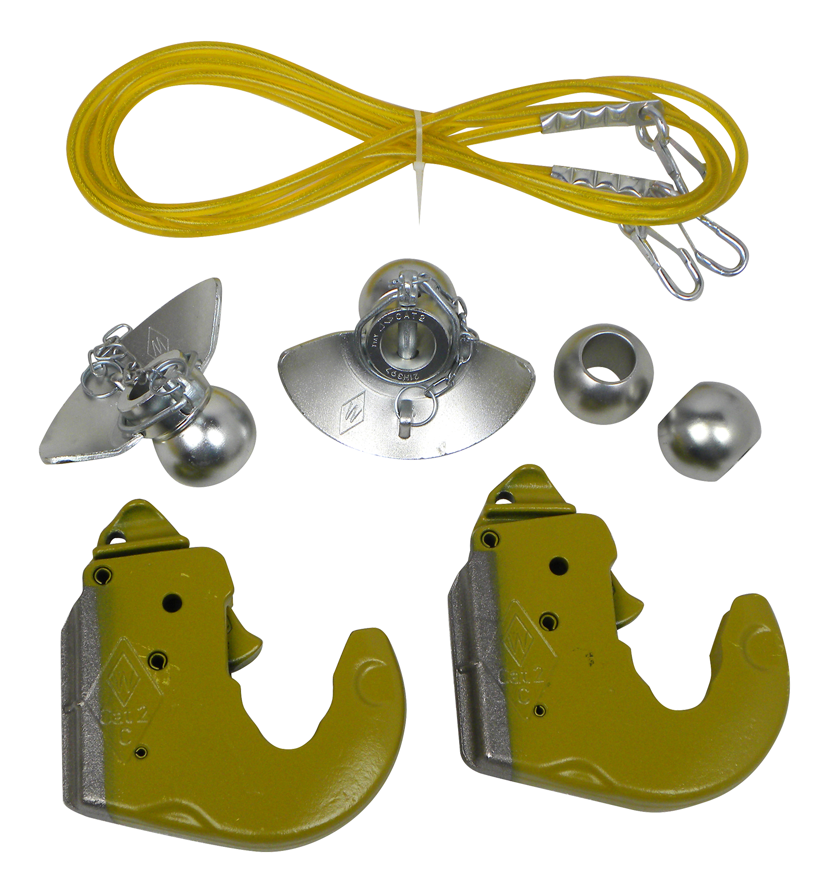 Lieferumfang: 2 Unterlenkerfanghaken, 2 Kugelfangprofile, 2 Fangkugeln, 1 Betätigungsseil, Anbau- und Bedienungsanleitung. Die Unterlenkerfanghaken aus hochfestem geschmiedeten Stahl sind mit einer arretierten Offenstellung ausgestattet. Die Verriegelung kann nur über den Öffnungshebel freigegeben werden. Eine selbsttätige Entriegelung ist ausgeschlossen.