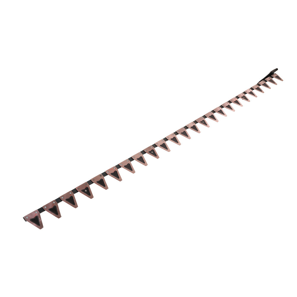 Untermesser zu bidux Doppelmesserbalken mit einer Gesamtklingenanzahl von 24 Stück. Davon sind 4 Stk. Klingen mit Pilz zur Aufnahme der Messerführungsarme. Die Teilung der Klingen im Abstand von Klingenmitte zu Klingenmitte ist 74 mm. Das Messer wird komplett mit dem aufgenieteten Untermesserkopf, auf der linken Seite in Fahrtrichtung gesehen, geliefert.