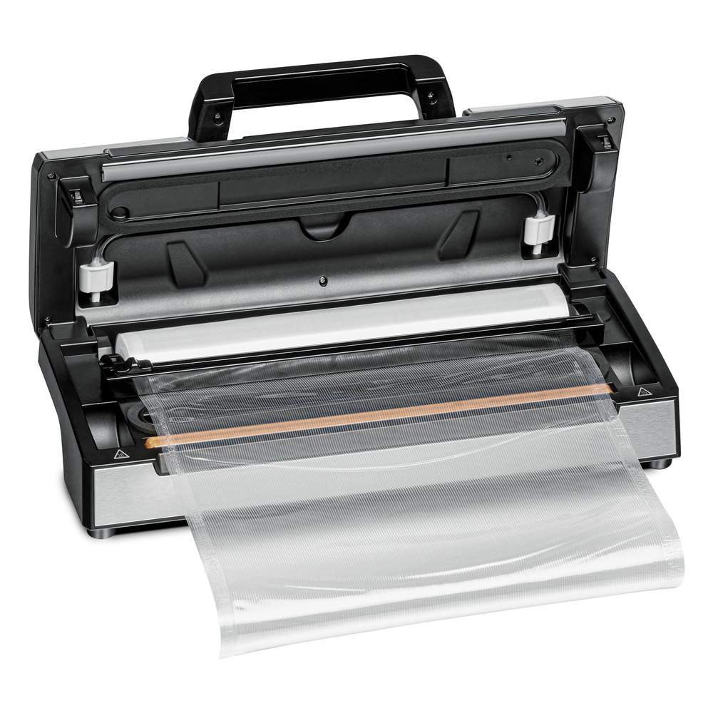 Lebensmittel ganz einfach lange frisch halten mit dem Vakuumiergerät VAC 385. Ein praktischer Handgriff ermöglicht die Einhandbedienung ohne Kraftaufwand. Die leistungsstarke Pumpe sorgt für einen Unterdruck von bis zu -0,8 bar, bevor die Beutel vollautomatisch versiegelt werden.