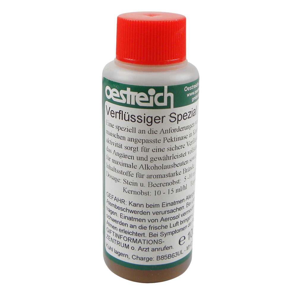 Eine speziell an die Anforderungen von Kernobst- und Topinamburmaischen angepasste Pektinase in Kombination mit hoher Cellulasesaktivität sorgt für eine sichere Verflüssigung der Maische, erleichtert das Angären und gewährleistet vollständiges Durchgären der Maische für maximale Alkoholausbeute sowie die Freisetzung wertvoller Inhaltsstoffe für aromastarke Brände.Dosage:Stein- und Beerenobst: 5-10 ml/hlKernobst: 10-15 ml/hlTopinambur: 20-50 ml/hl