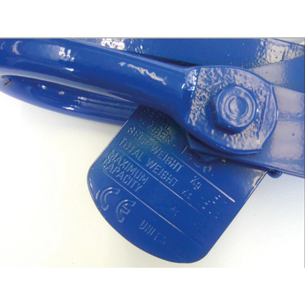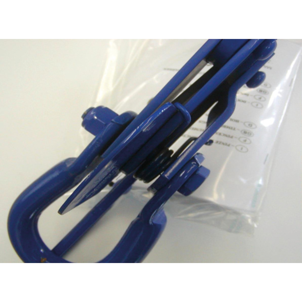 Geschmiedet aus Spezialstahl, Schenkel in federndem Doppelgelenk aufgehängt, geschmiedete Lasthakenöse und Öffnungshebel mit Kettendurchführungsloch.