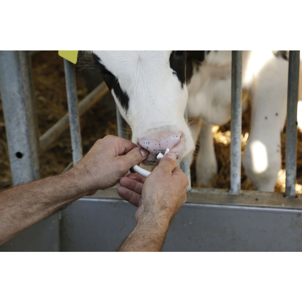 Der innovative und neuartige Viehsaugentwöhner SuckStop Müller überzeugt durch seine spielend einfache Handhabung, durch den erzielten Lerneffekt beim Tier als auch durch die Verbesserung des Tierwohls. Besonders einfach kann der Viehsaugentwöhner eingesetzt und auch wieder herausgenommen werden. Der Ring verfügt über eine gewisse Elastizität, durch die er ohne Hilfsmittel angebracht werden kann. Er wird auf einer Nasenseite eingehakt und durch Dehnen des Rings in die andere Seite eingeführt. Die Fortsätze zeigen dabei nach oben.Herkömmliche Saugentwöhnungsringe haben nach außen gerichtete Stacheln, die das andere Tier irritieren und es zu einer Abwehrreaktion kommt. Das Tier mit starkem Saugbedürfnis lernt aus dieser Situation nicht. Anders ist es bei dem neuartigen und innovativen Viehsaugentwöhner SuckStop Müller. Dieser korrigiert das besaugende Tier. Die nach innen gerichteten, abgerundeten Fortsätze drücken dem Tier beim Besaugen eines anderen Tieres in der Nase. Durch diesen Impuls wird die Handlung gestört und das Fehlverhalten unterbunden. Es ist ein langfristiger Lerneffekt zu erkennen und das schon nach einigen Wochen.Der innovative Viehsaugentwöhner wird ohne Hilfsmittel angebracht und befestigt. Der Ring kann nicht zu eng angebracht werden und die Nasenscheidewand verletzen.Die Tiere mit neu angebrachten Ringen nehmen nach kurzer Zeit schon wieder Futter und Wasser auf, da sie keine Schmerzen verspüren. Auch Nippel- und Zungentränken werden mit den Viehsaugentwöhnern SuckStop Müller von den Tieren problemlos benutzt. Somit kommt es zu keinen Leistungseinbußen in der Herde.FAIE Tipp: Damit die Wirksamkeit voll gegeben ist, sollte die richtige Größe für das Tier gewählt werden. Wichtig ist, dass der Ring an der Nase anliegt! Der Sitz des Rings sollte regelmäßig kontrolliert werden - wenn sich der Ring nicht mehr bewegen lässt und zu eng an der Nasenscheidewand anliegt, sollte auf die nächste Größe gewechselt werden!