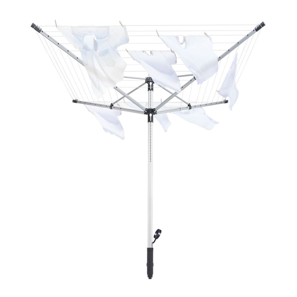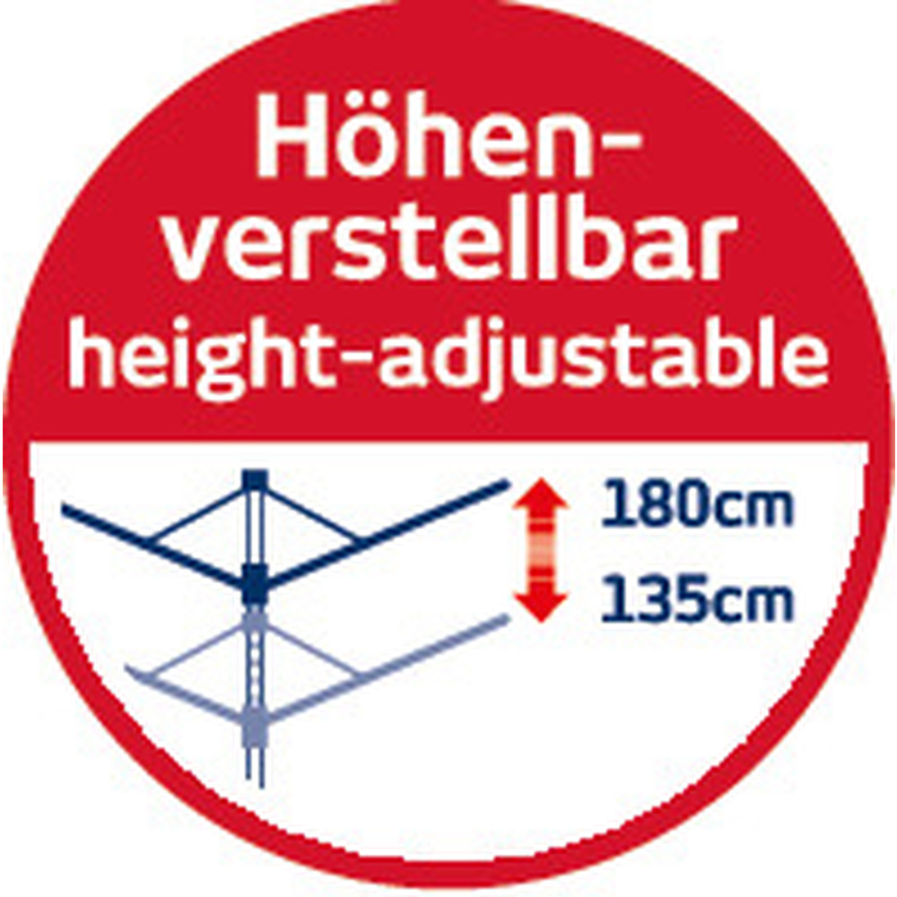 Besonders stabil dank massivem Standrohr und Stahltragarmen. Mit 50 Metern Leinenlänge, die Platz bieten für bis 5 Waschmaschinenfüllungen. Für mehr Arbeitskomfort individuelle Einstellung der Leinenhöhe von 135 bis 180cm. Mit 12 Kleiderbügelhalter für das faltenfreie Trocknen von Hemden und Blusen. Inklusive Schutzhülle und Bodenhülse.