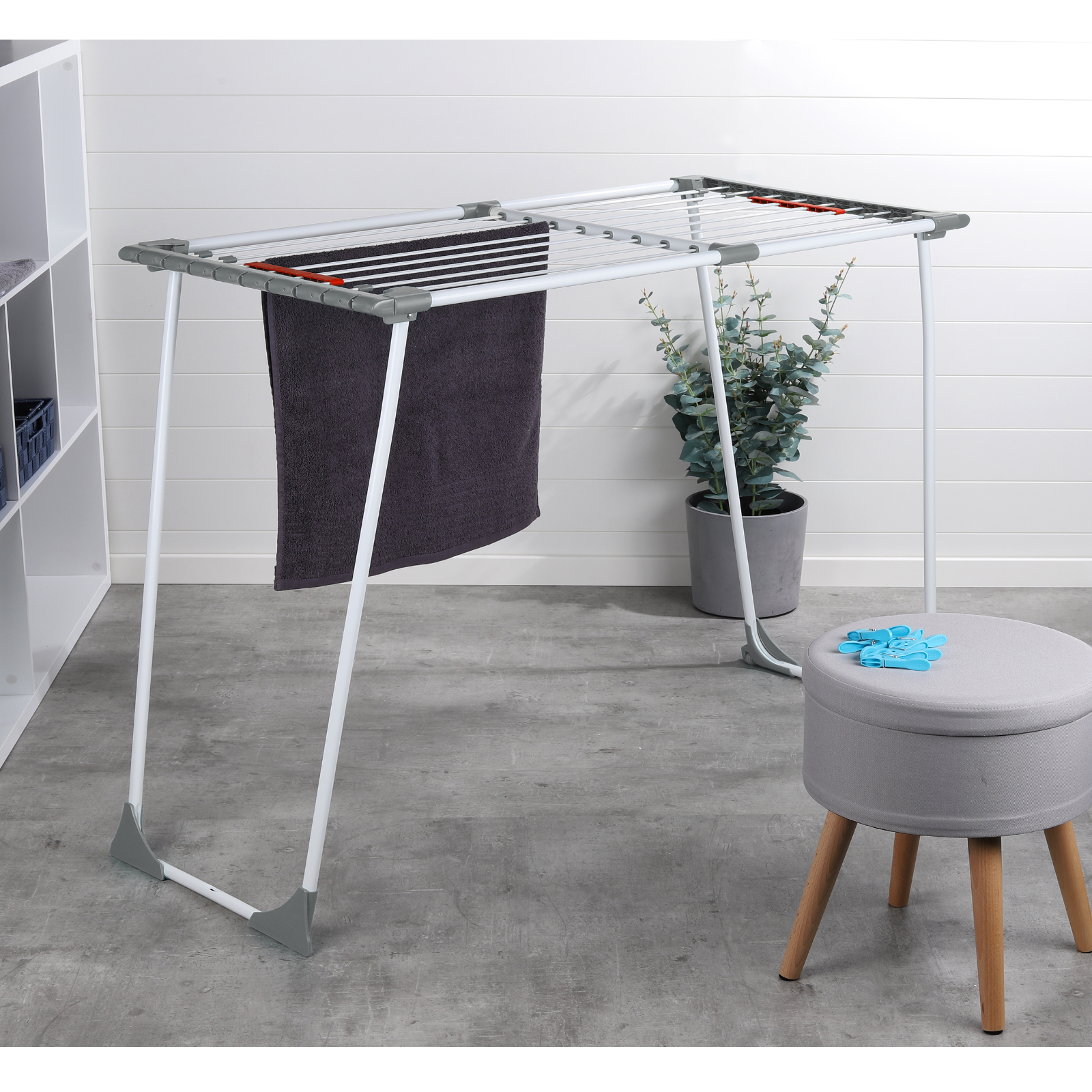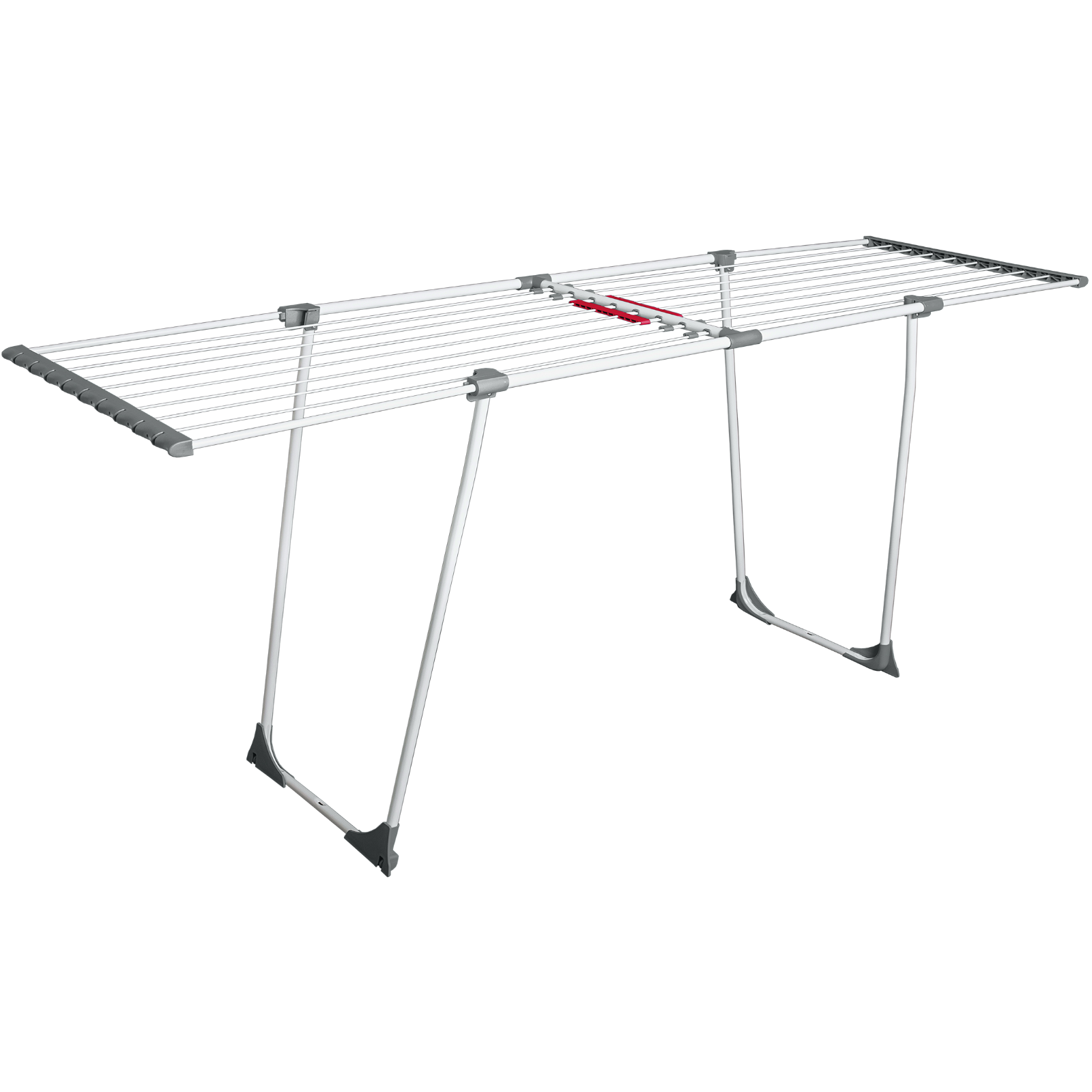 Sicherer und praktischer Wäschetrockner: Parallele Standbeine, Rollen für einfaches Umstellen und integrierte Sockenhalter.Ausziehbar bis 2,0 m Trockenlänge.Kompakte Lagerung (ca. 113 x 55 x 6cm).Bis 15 kg.
