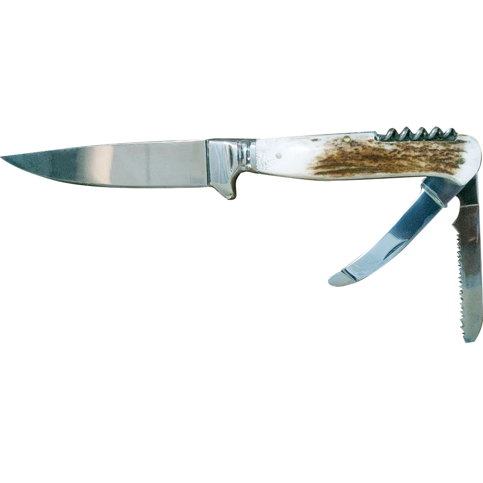 Ein altes deutsches Traditionsmesser mit bayrisch geschmiedeter Nicker Klinge, das speziell für den Jagdbereich entwickelt worden istAus 1.4116 Stahl, 55 bis 56 HRC RockwellhärteGesamtlänge 23 cm. Klinge ist 11 cm lang. Mit Korkenzieher, Aufbruch-Klinge und Sägeklinge. Griffmaterial Hirschhorn und dazu eine Lederscheide.