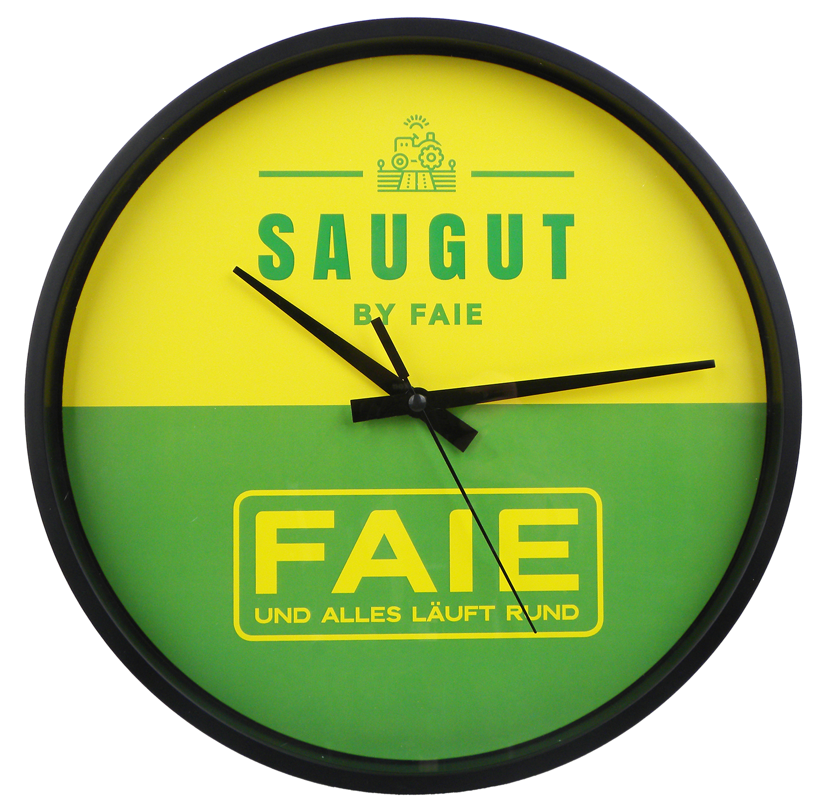 Das Ziffernblatt ist in kräftigem Gelb-Grün gestaltet und trägt das markante FAIE-Logo. Die schwarzen Zeiger sorgen für klare Lesbarkeit, ganz ohneSchnickschnack. Die Wanduhr hat einen Durchmesser von ca. 30 cm und besteht aus stabilem Kunststoff – leicht, robust und einfach zu reinigen. Dank des präzisen Quarzwerks läuft sie zuverlässig und leise.