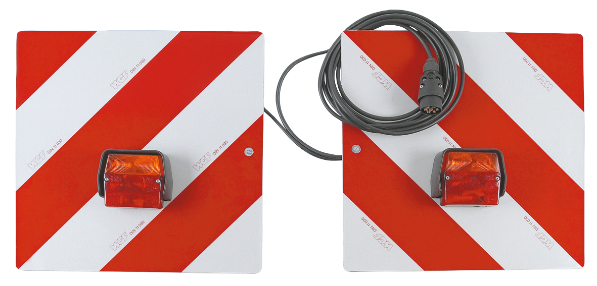 12V, komplett verkabelt mit Beleuchtung zur Festmontage, 2 Warntafeln DIN 11030, einseitig retroreflektierend mit Dreifunktionsleuchte nach hinten. 3,5 m Verbindungskabel, 5 m Zuleitung mit 7-poligem Stecker, ohne Halterungen, schraubbar