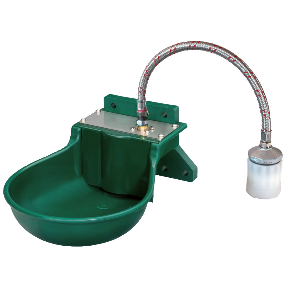 Kunststofftränkebecken mit Schwimmerventilzum Anschluss an IBC-Tanks. Tiergerechte Tränke ohne Druckzunge, sehr robust und verbisssicher. Gekapselter Messingschwimmer, vor Schmutz geschützt. Komplett mit Schlauchanschluss, Stahlgewebeschlauch und verzinkter Befestigungsplatte, für Niederdruck, mit Ablaufstopfen zur leichten Reinigung.