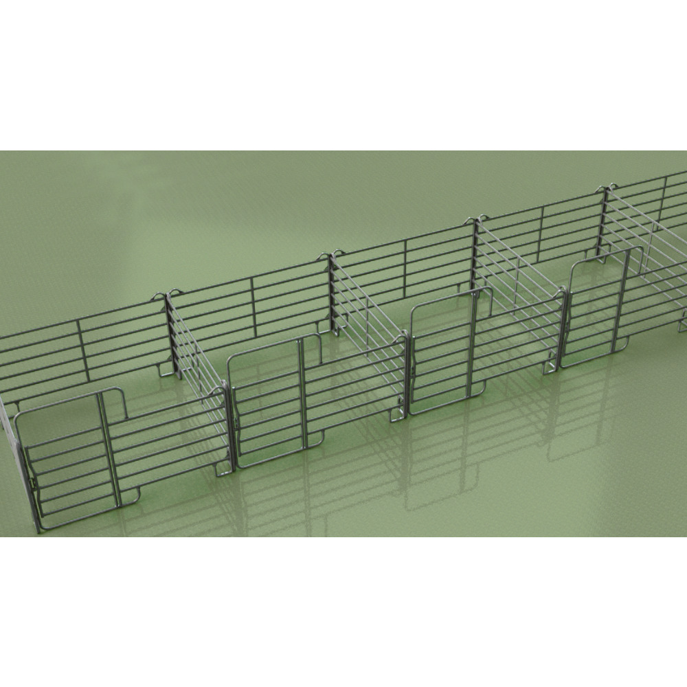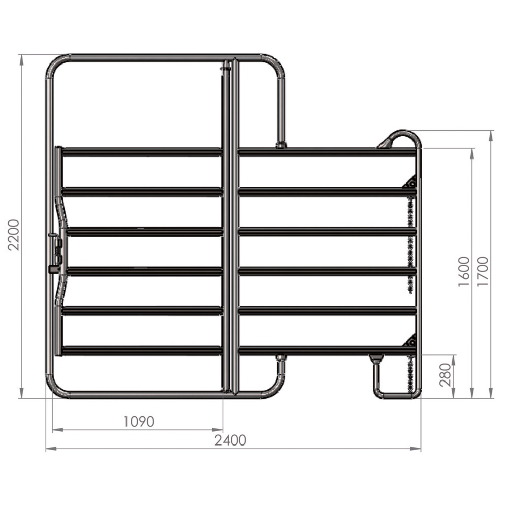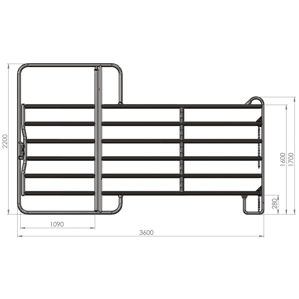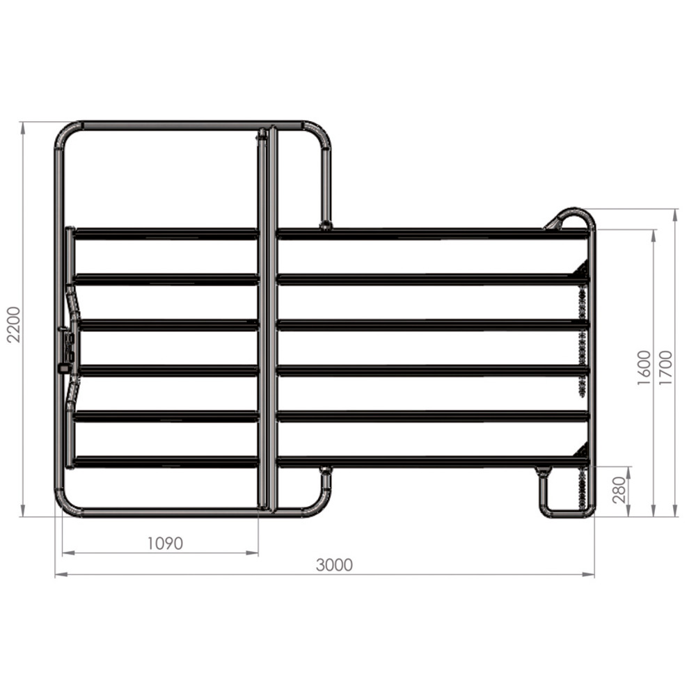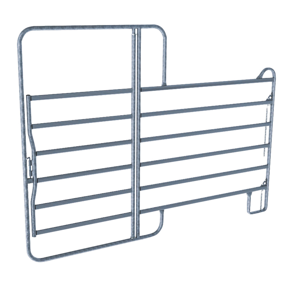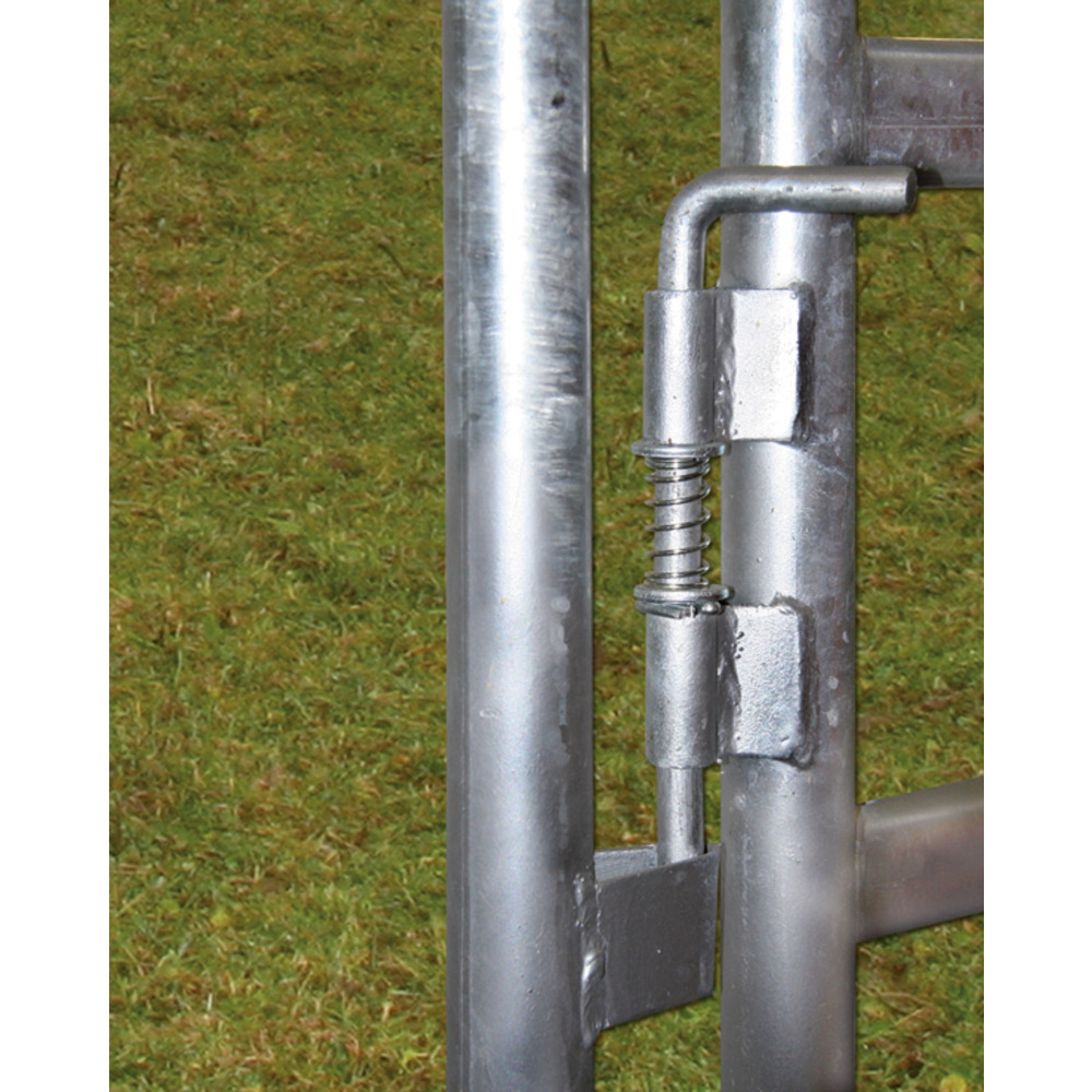 Das Panel mit Tor ermöglicht den Einbau eines Durchgangs in die Einzäunung. DieGesamthöhe beträgt 2,20 m (Toreingang) und die Torbreite 1 m. Die Höhe der obersten Zaunstange beträgt 1,60 m. Mit Verschlussriegel zum Öffnen und Schließen der Einzäunung; komplett feuerverzinkt.