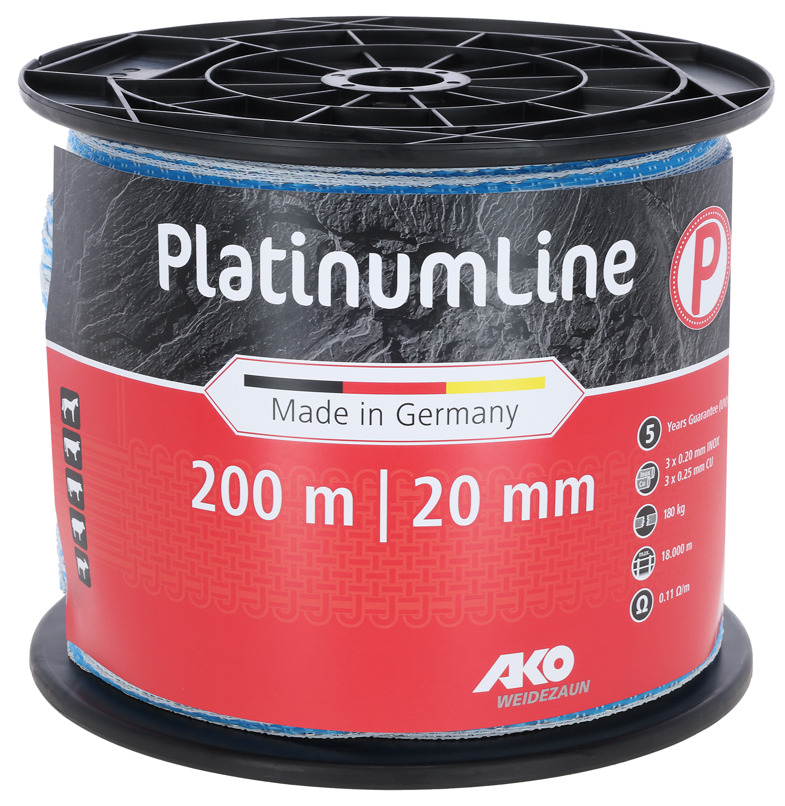 Das hochwertiges Weidezaunband mit extra dicken Monofäden, verstärkten Außenkanten und verzinnten Kupferdröhten bitetet höchste Hütesicherheitund ist besonders langlebig.